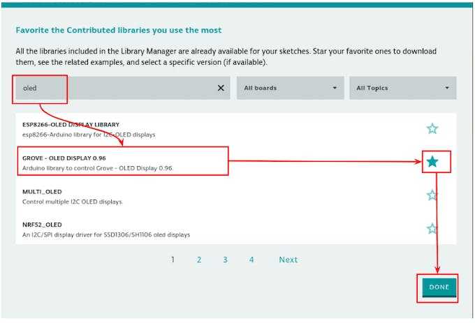 As already done for the pressure sensor., we have to use the Library Manager in order to install the right library. Just search for "oled" and star the Grove Oled Display 0.96 library