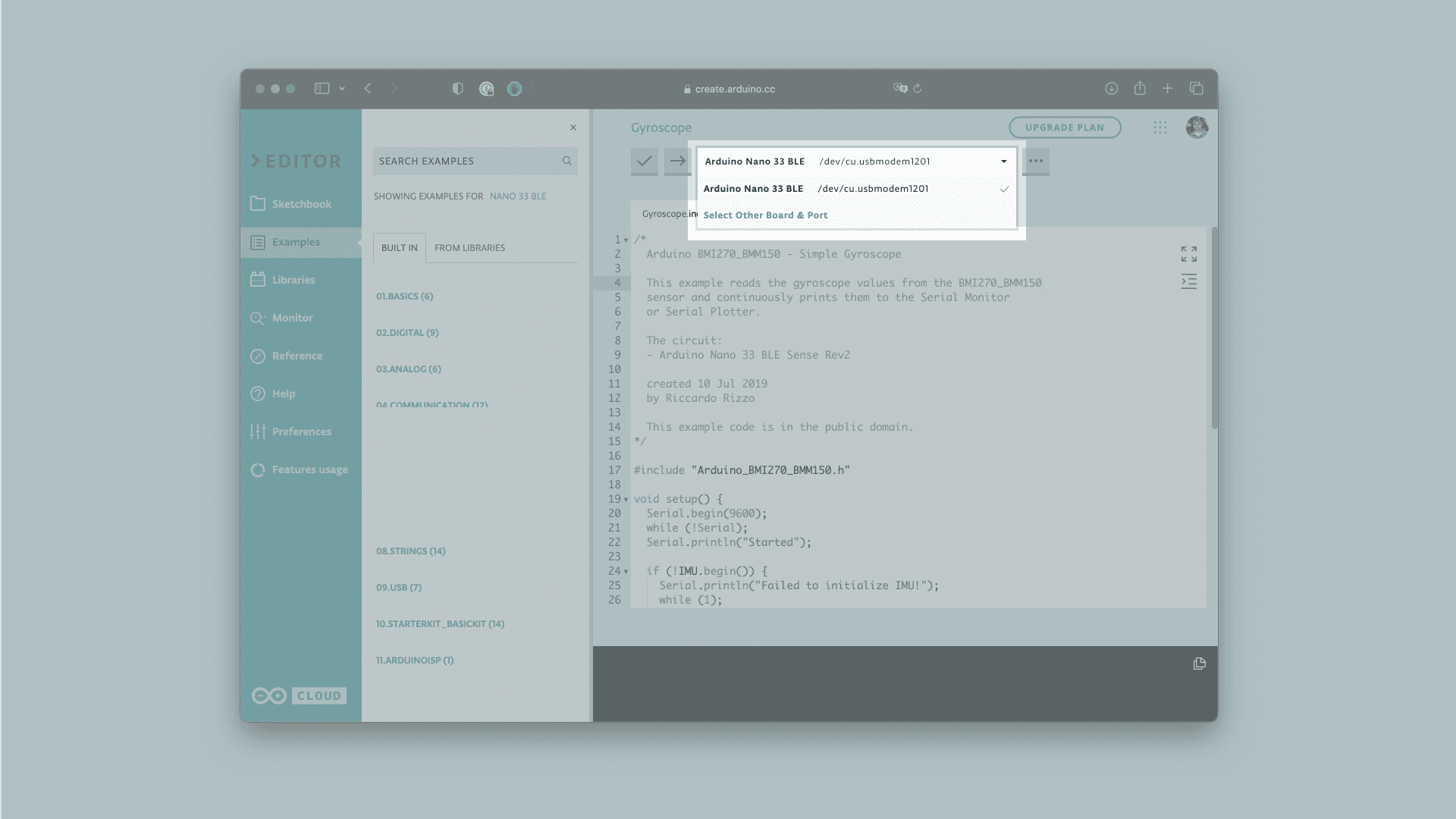 Now, connect the Nano 33 BLE Rev2 to the computer and make sure that the Cloud Editor recognizes it, if so, the board and port should appear as shown in the image below. If they don't appear, follow the instructions to install the plugin that will allow the editor to recognize your board.
