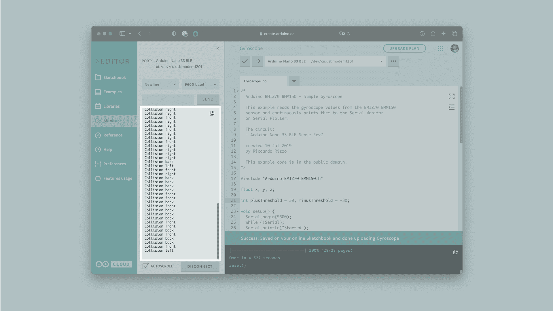 44 if(y > plusThreshold)45 {46 Serial.println("Collision front");47 delay(500);48 }49 if(y < minusThreshold)50 {51 Serial.println("Collision back");52 delay(500);53 }54 if(x < minusThreshold)55 {56 Serial.println("Collision right");57 delay(500);58 }59 if(x > plusThreshold)60 {61 Serial.println("Collision left");62 delay(500);63 }64 }65}Testing It Out
