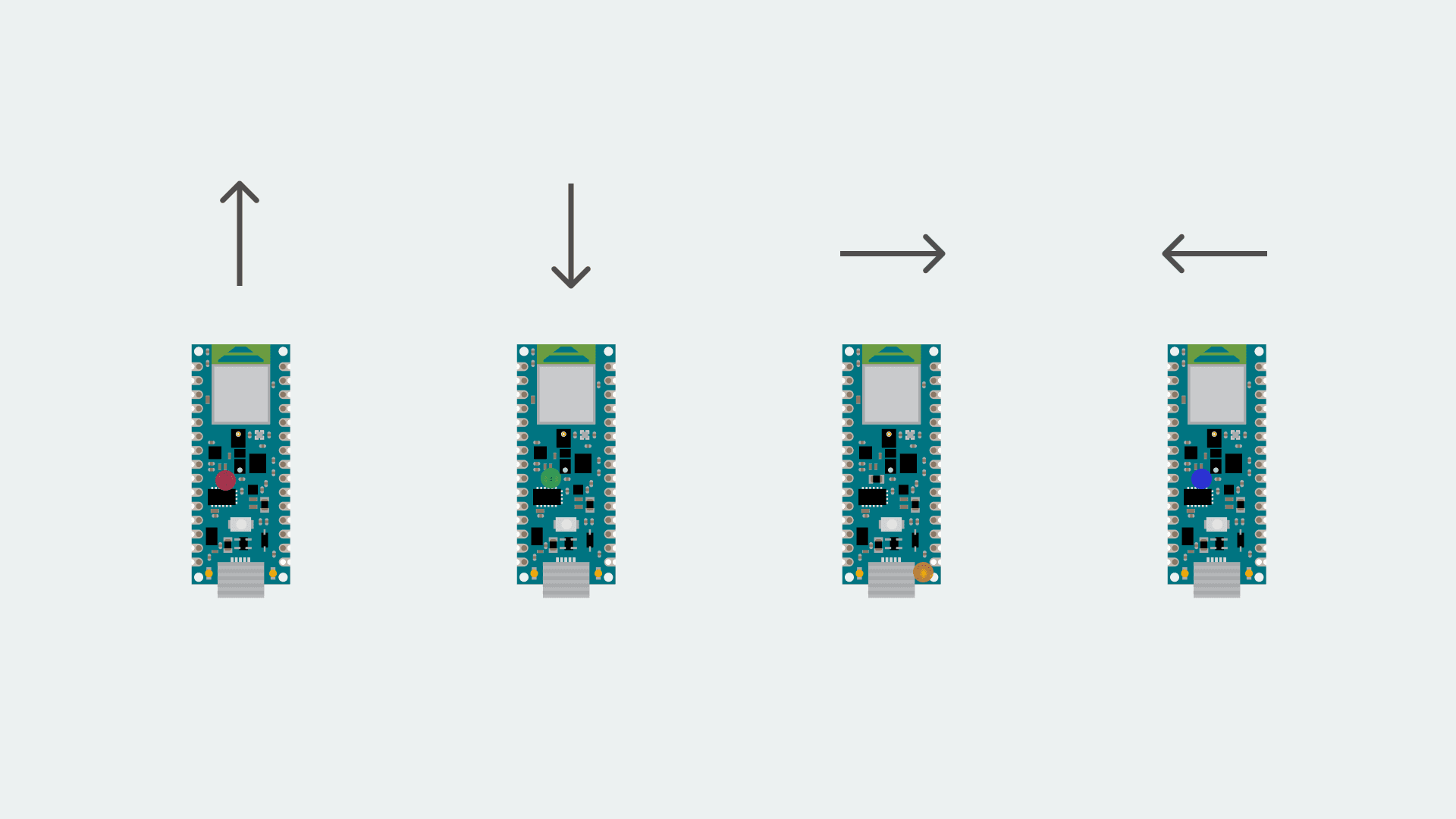 In order to test out the code, you could begin by stabilizing your board on a standing position in front of you (USB port facing down) and carry on by making directional UP-DOWN-RIGHT-LEFT hand gestures. Try to make your movement as clear as possible, yet subtle enough for the sensor to pick it up.