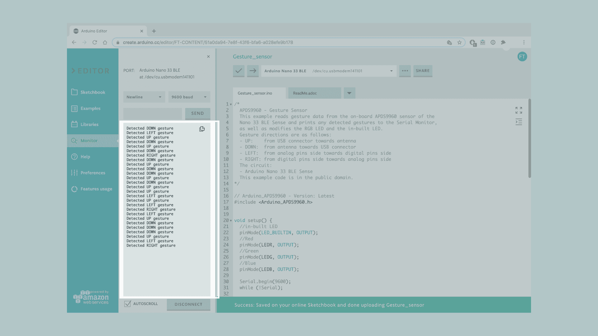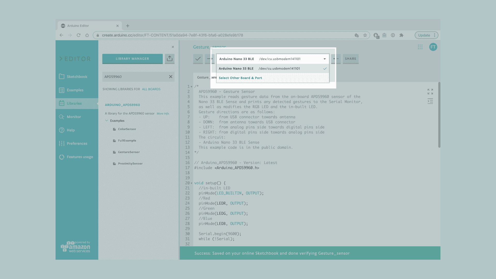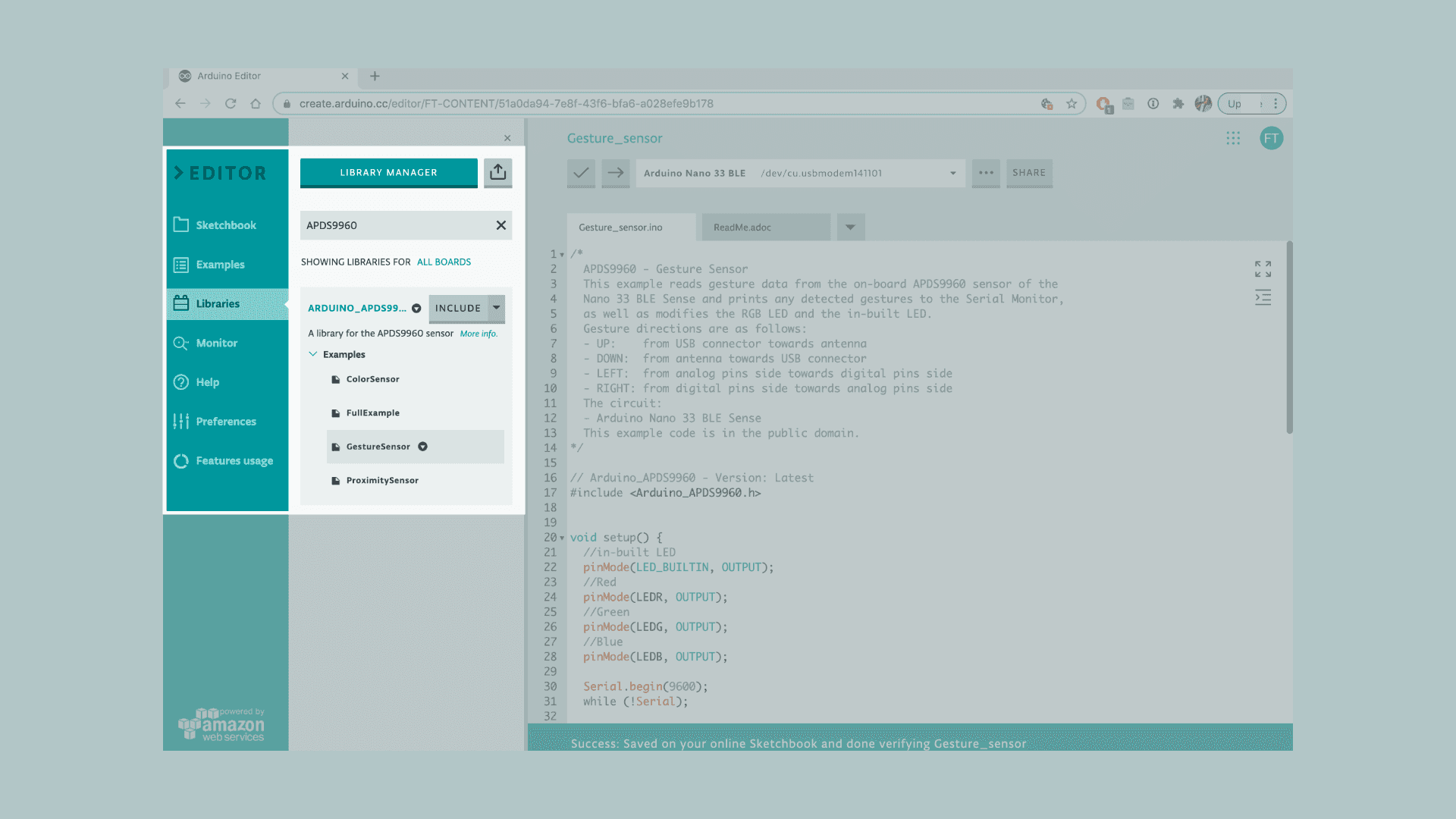 Let's start by opening the Arduino Web Editor, click on the Libraries tab and search for the APDS9960 library. Then in > Examples, open the GestureSensor sketch and once it opens, you could rename it as Gesture&LEDs.