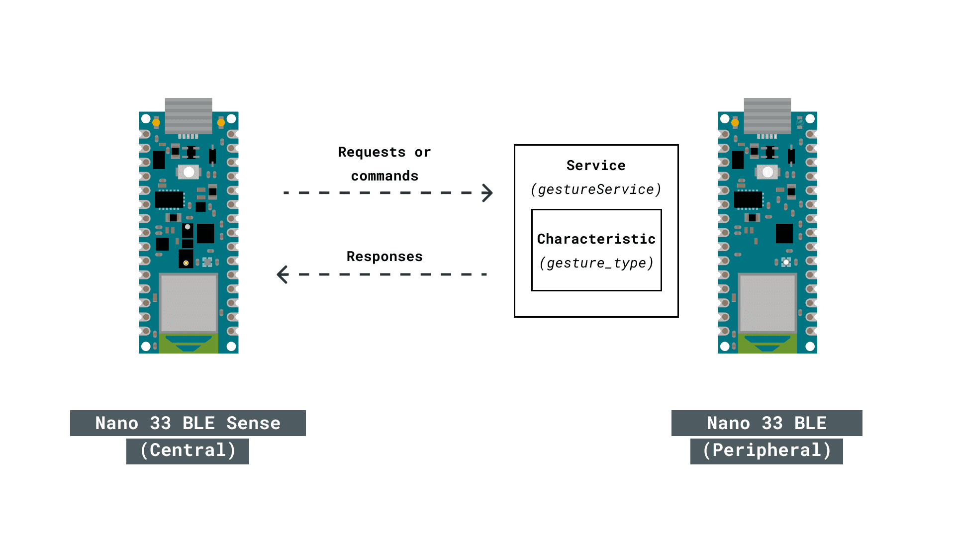 The central device, the Nano 33 BLE Sense, is going to connect to the peripheral device, the Nano 33 BLE, and will look for the service called gestureService. Once a connection is established between the central and the peripheral device, if the central device detects a gesture with its gesture sensor, it will write the type of the gesture detected in the gesture_type characteristic of the gestureService. Then, based on the value stored in the gesture_type characteristic, the built-in RGB LED of the peripheral device, the Nano 33 BLE, will turn on a specific color depending on the stored value in the gesture_type characteristic.