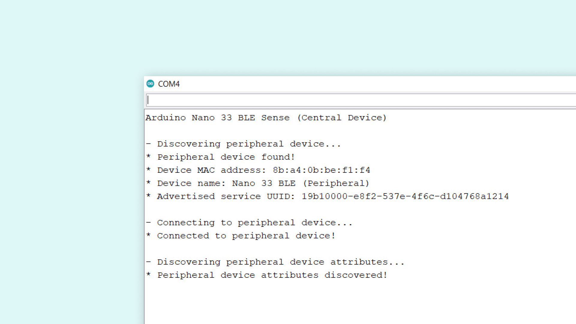 The peripheral device can also give us feedback through the serial port. We can verify with that feedback that the peripheral device (Arduino Nano 33 BLE) is working as expected by selecting the right port of the peripheral device and opening the Serial Monitor. In the Serial Monitor, we should see the following: