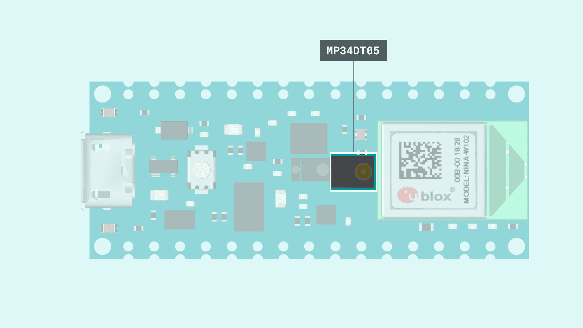 To access the data from the MP34DT05, we need to use the PDM library that is included in the Arduino Mbed OS Nano Boards Package. If the Board Package is installed, you will find an example that works by browsing File > Examples > PDM > PDMSerialPlotter.