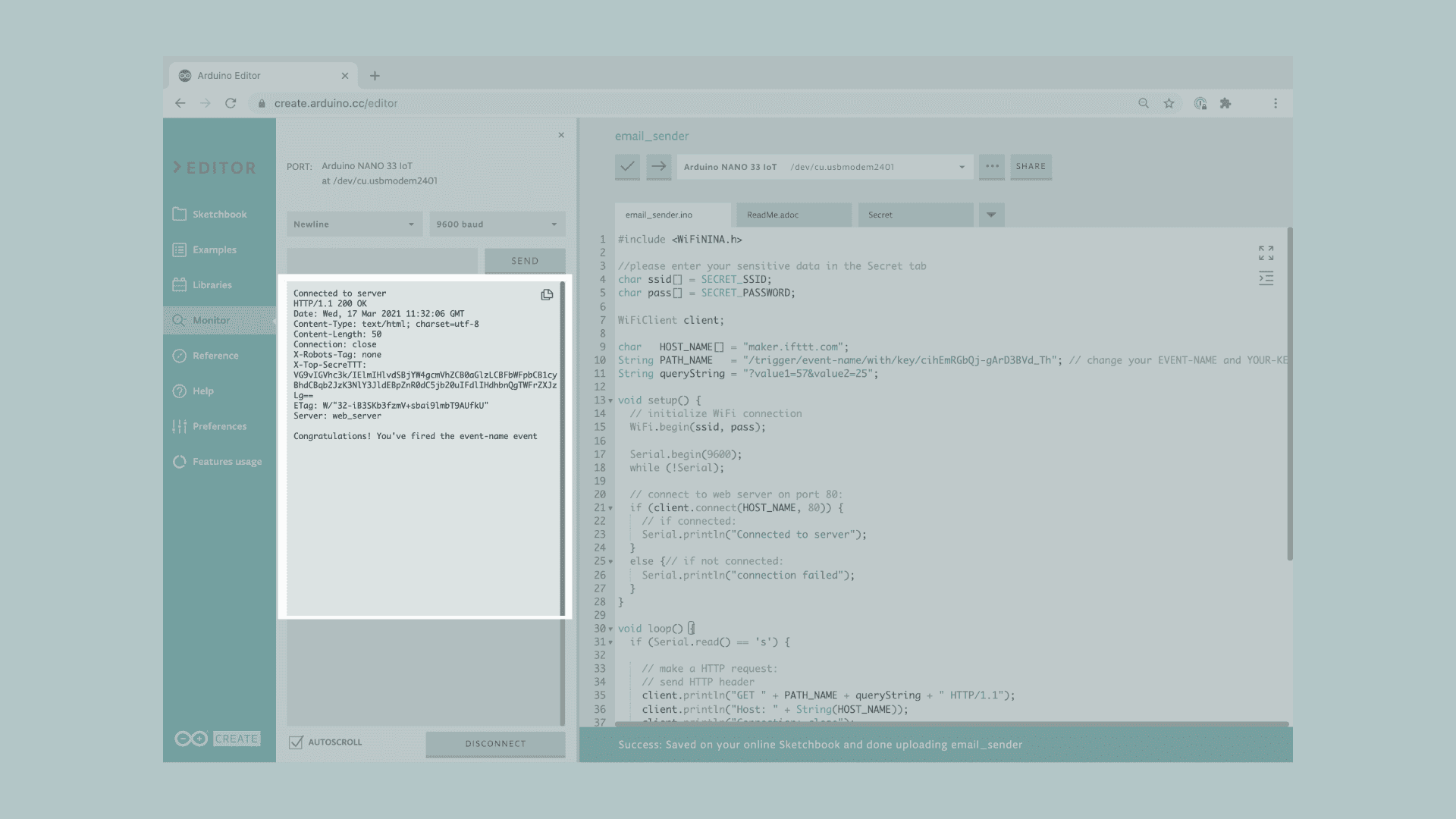 PATH_NAME in the space for your-key. Then we need to change the event-name to the event name we choose in our sketch before, in this case sketch_received. Lastly, we just need to upload to code to the board.Everything is ready! Now we just need to open the Serial Monitor, to see if the client is connected and whenever we enter an