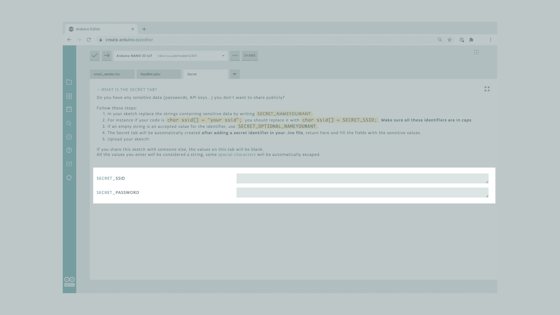 1//please enter your sensitive data in the Secret tab2char ssid[] = SECRET_SSID; // your network SSID (name)3char pass[] = SECRET_PASS; // your network password (use for WPA, or use as key for WEP)This will automatically create two fields in the Secret tab. If we go back to this tab, we can enter our credentials there.