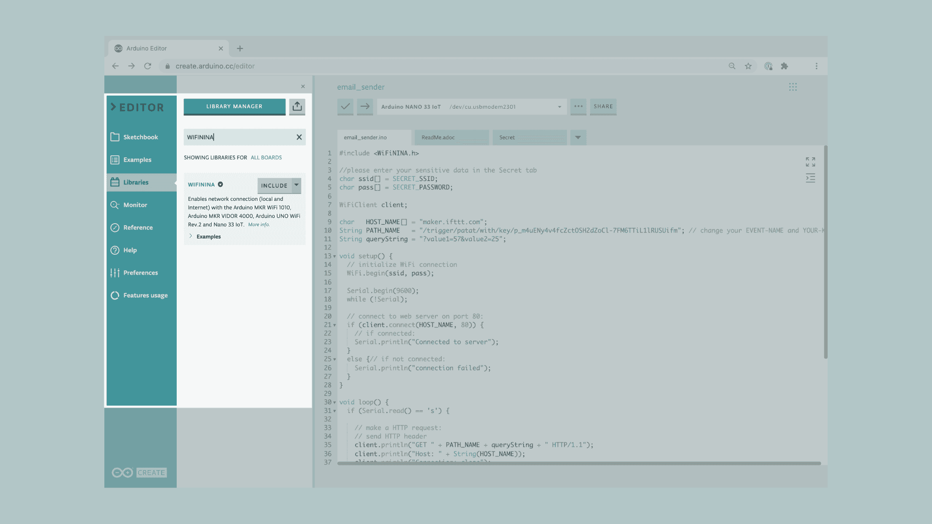 Let's start by opening the Arduino Web Editor, create a new sketch and name it email_sender. Then, navigate to the Libraries tab, search for the WIFININA library and click on the Include button.