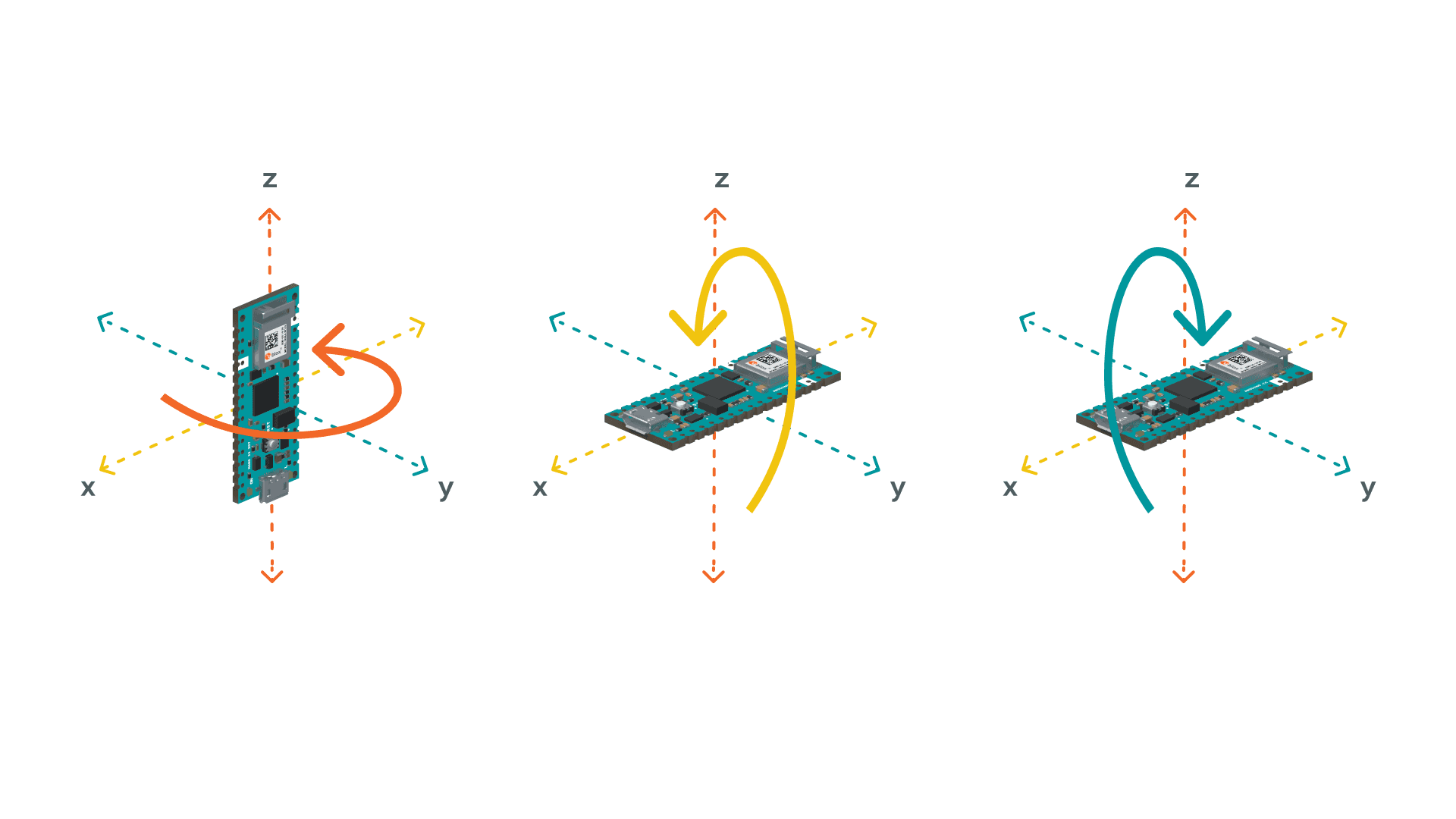 In this example, we will use the gyroscope as an indicator for the direction of the force that is applied to the board. This will be achieved by swiftly moving the board for an instant in four directions: forward, backward, to the left and to the right. The results will be visible through the Serial Monitor.
