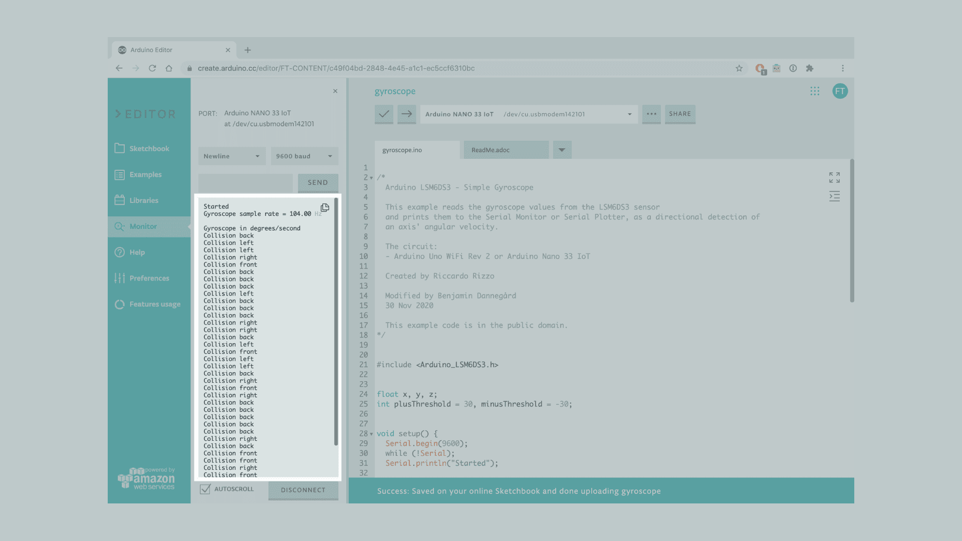 This tutorial will focus on the 3-axis gyroscope sensor of the LSM6DS3 module, on the Arduino Nano 33 IoT, in order to measure the direction of force on the board to emulate an object's crash. This will be achieved by utilizing the values of the gyroscope's axes and later print the return values through the Arduino IDE Serial Monitor.