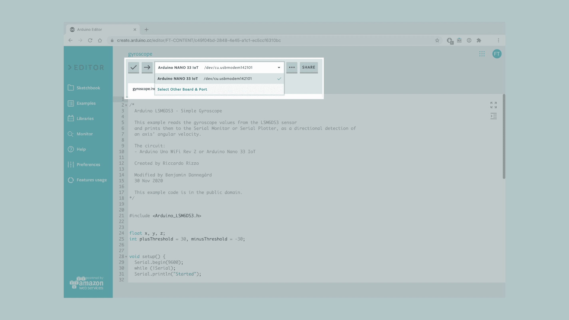 Let's start by opening the Arduino Web Editor, click on the Libraries tab and search for the LSM6DS3 library. Then in > Examples, open the SimpleGyroscope sketch and once it opens, rename it as Gyroscope.