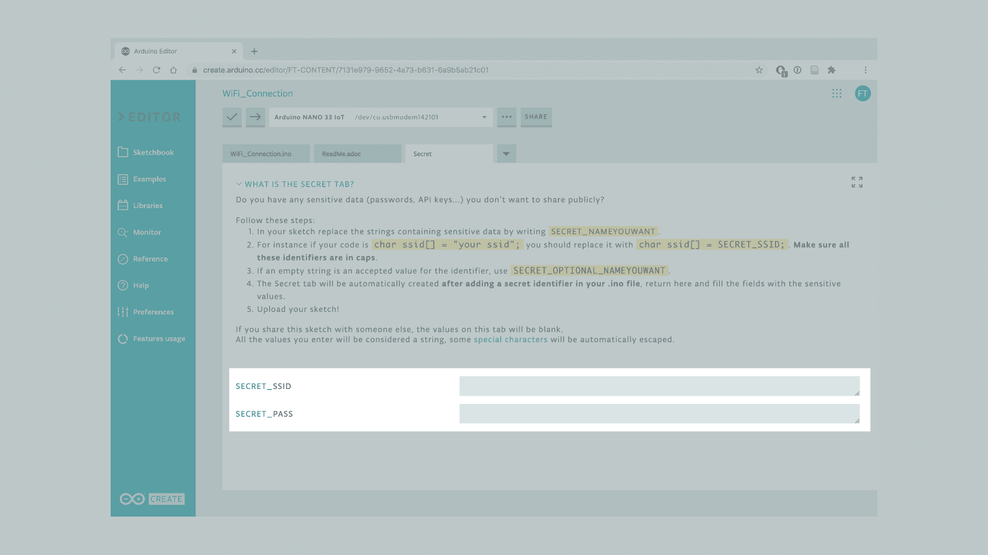 1//please enter your sensitive data in the Secret tab2char ssid[] = SECRET_SSID; // your network SSID (name)3char pass[] = SECRET_PASS; // your network password (use for WPA, or use as key for WEP)This will automatically create two fields in the Secret tab. If we go back to this tab, we can enter our credentials there.