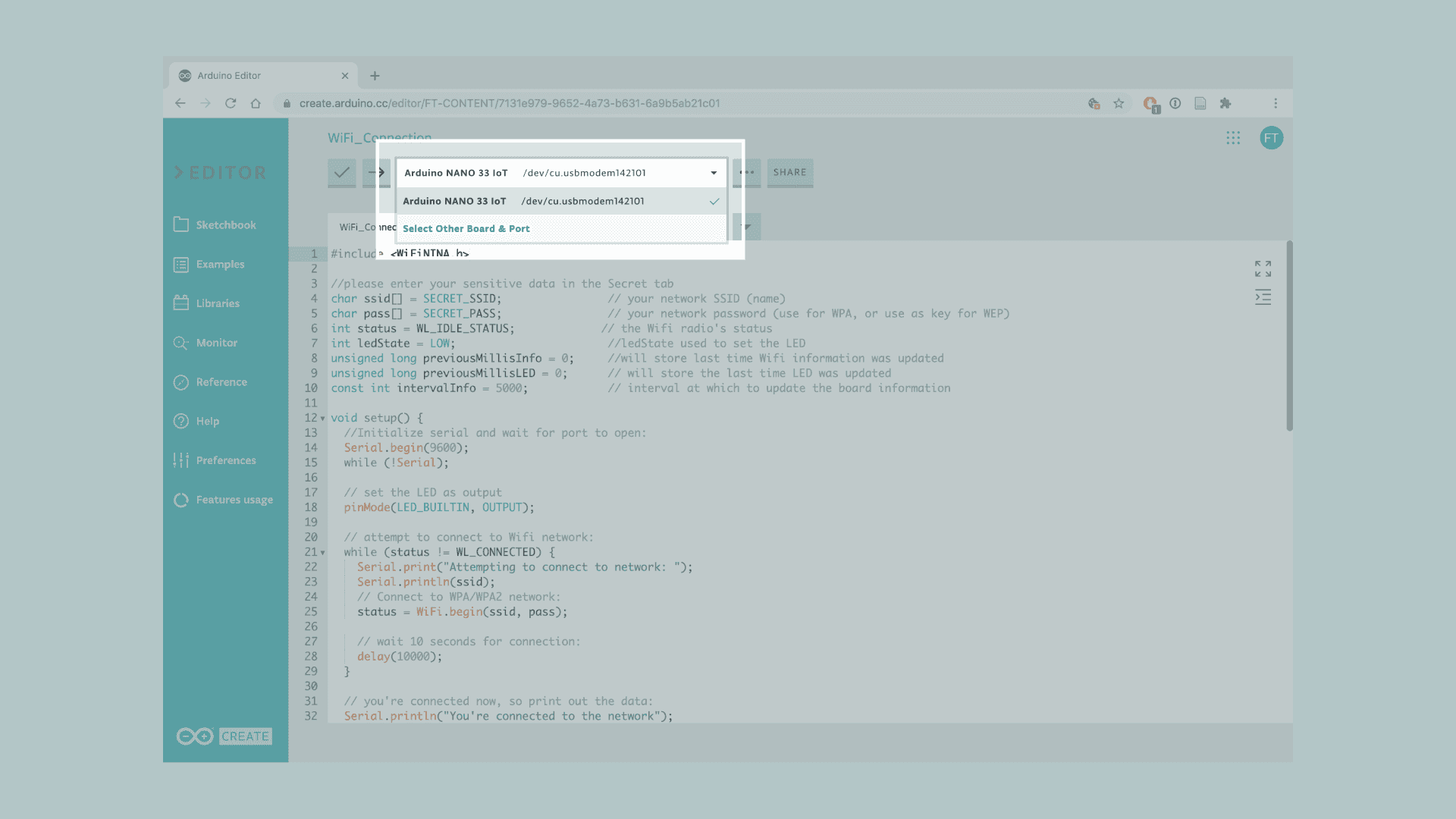 Next, connect the Arduino Nano 33 IoT to the computer and make sure that the Web Editor recognizes it. If so, the board and port should appear as shown in the image below. If they don't appear, follow the instructions to install the plugin that will allow the Editor to recognize your board.