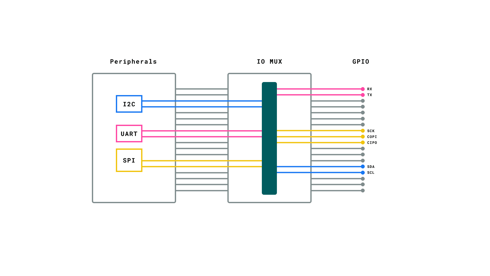 The ESP32-S3 SoC features an IO mux (input/output multiplexer) and a GPIO matrix. The IO mux acts as a data selector and allows for different peripherals to be connected to a physical pin.