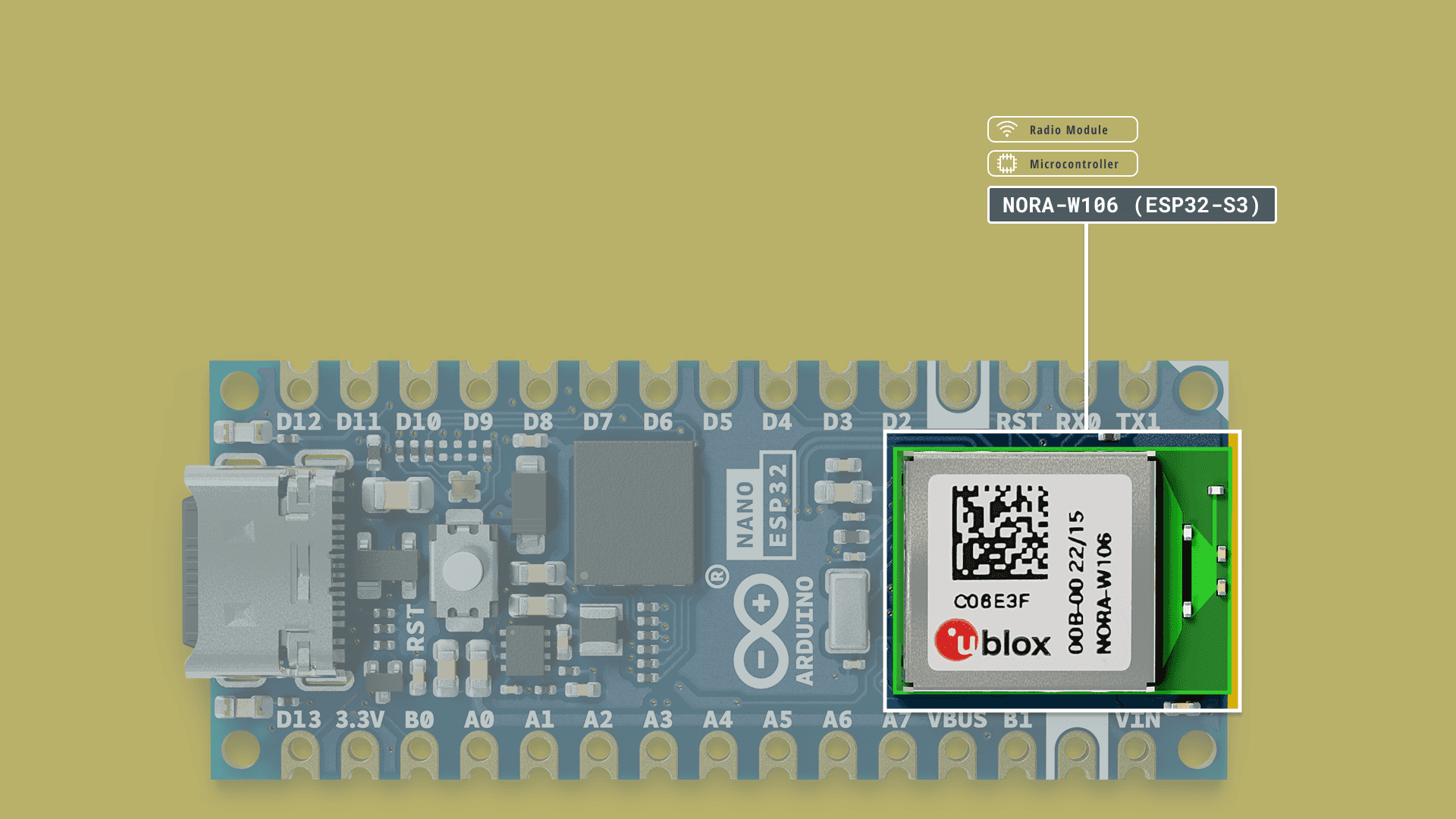 The Arduino Nano ESP32 is the first Arduino to feature an ESP32 SoC as its main microcontroller, based on the ESP32-S3. This SoC is found inside the u-blox® NORA-W106 module and provides both Bluetooth® & Wi-Fi® connectivity, as well as embedding an antenna.