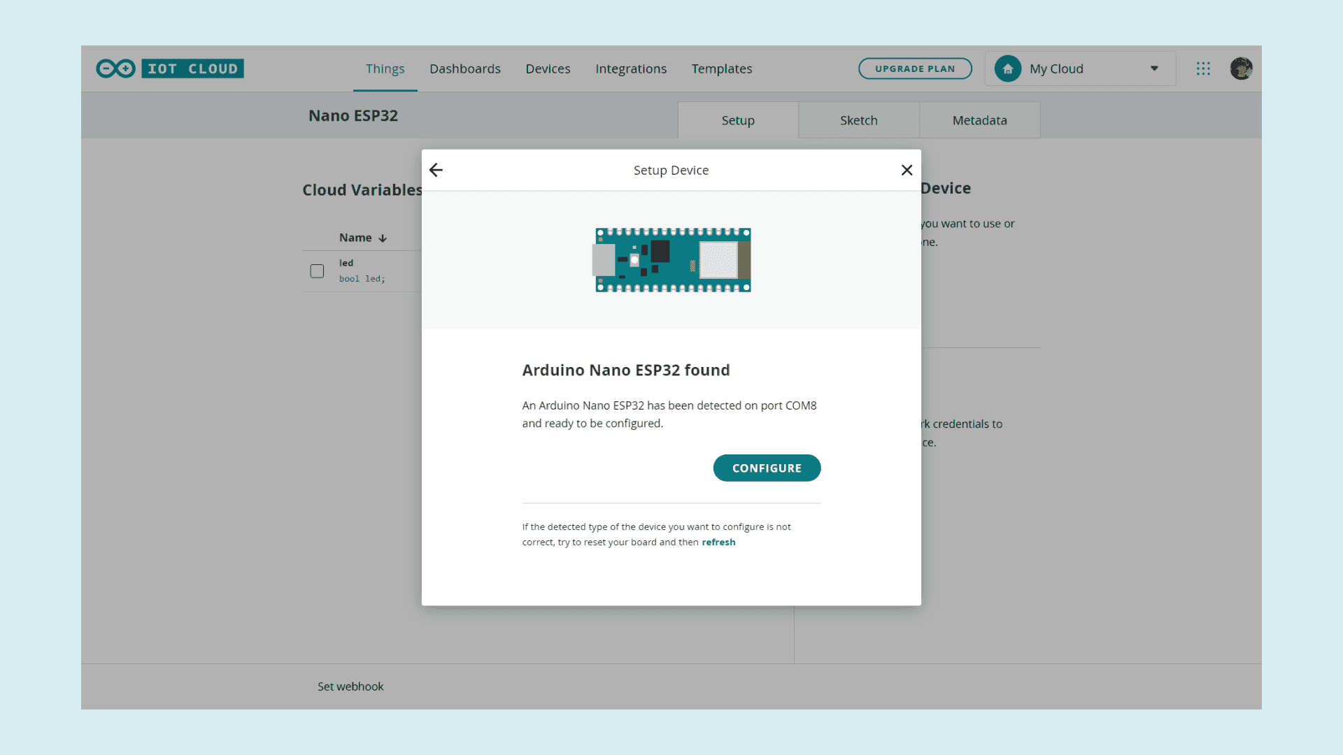 You have now successfully set up your Nano ESP32 to work with the IoT Cloud. To get started with your first IoT project, check out our Getting Started With the Arduino Cloud guide.