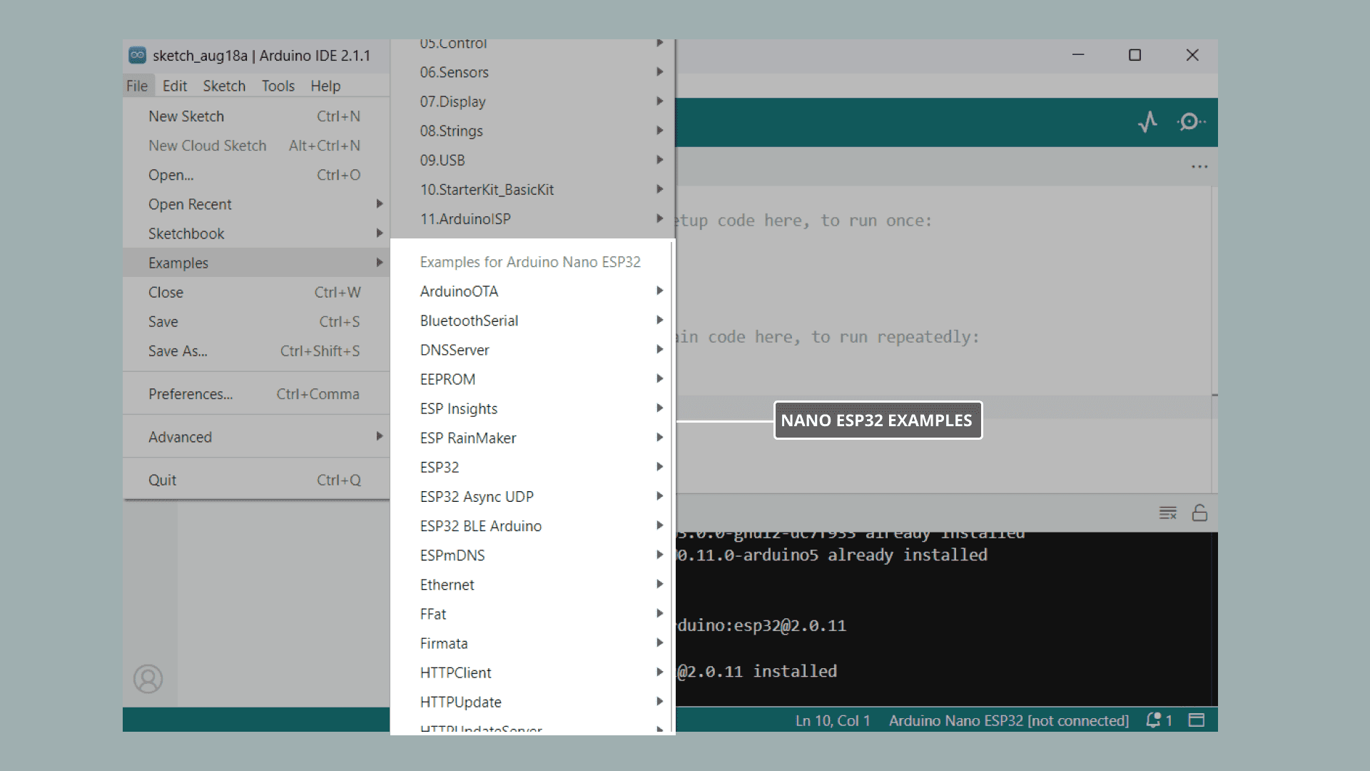 There are several examples available for the Nano ESP32 board, which can be accessed directly in the IDE, through File > Examples. These examples can be used directly without external libraries.