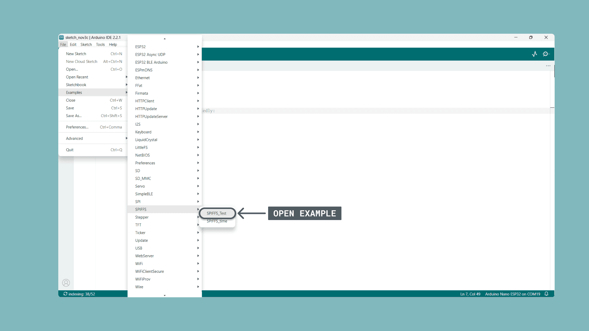 Start by opening the SPIFFS_Test example by navigating to: