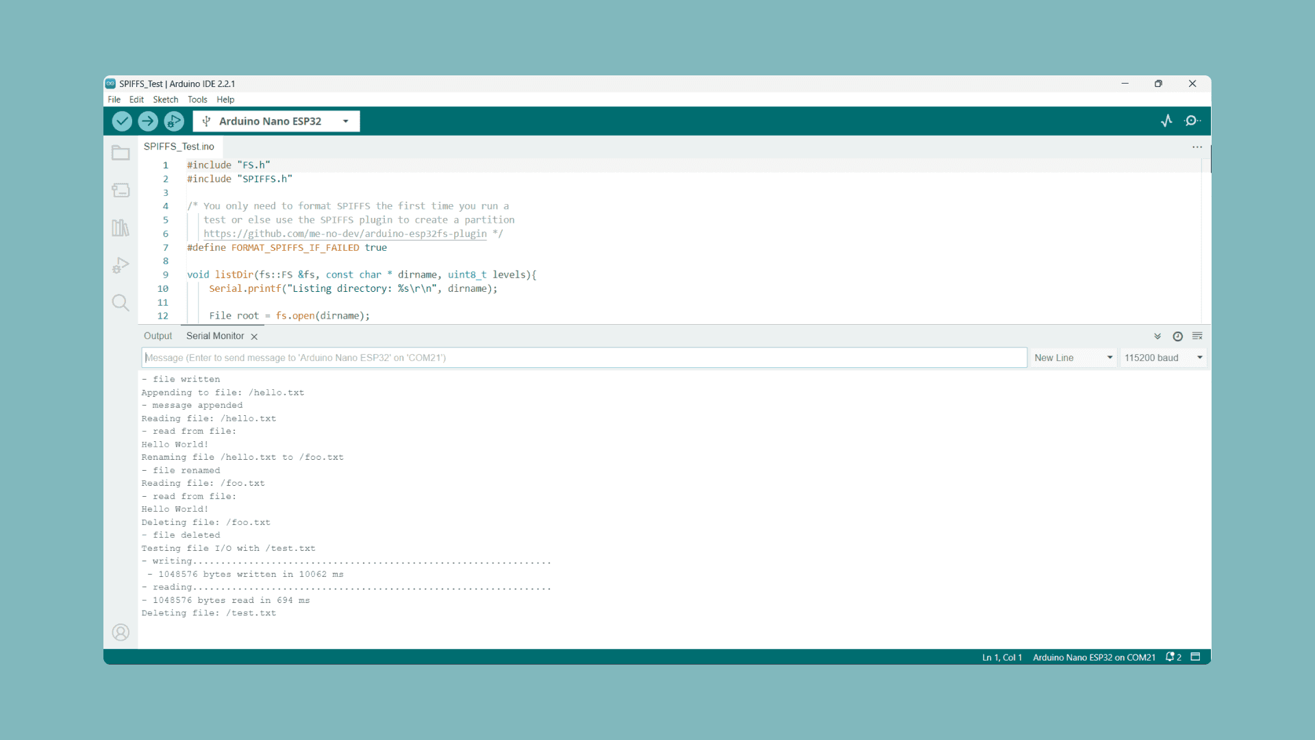 1void setup(){2 Serial.begin(115200);3 if(!SPIFFS.begin(FORMAT_SPIFFS_IF_FAILED)){4 Serial.println("SPIFFS Mount Failed");5 return;6 }7 8 listDir(SPIFFS, "/", 0);9 writeFile(SPIFFS, "/hello.txt", "Hello ");10 appendFile(SPIFFS, "/hello.txt", "World!\r\n");11 readFile(SPIFFS, "/hello.txt");12 renameFile(SPIFFS, "/hello.txt", "/foo.txt");13 readFile(SPIFFS, "/foo.txt");14 deleteFile(SPIFFS, "/foo.txt");15 testFileIO(SPIFFS, "/test.txt");16 deleteFile(SPIFFS, "/test.txt");17 Serial.println( "Test complete" );18}- All messages printed on the serial monitor are defined in the respective function, except "Test Complete" which printed by