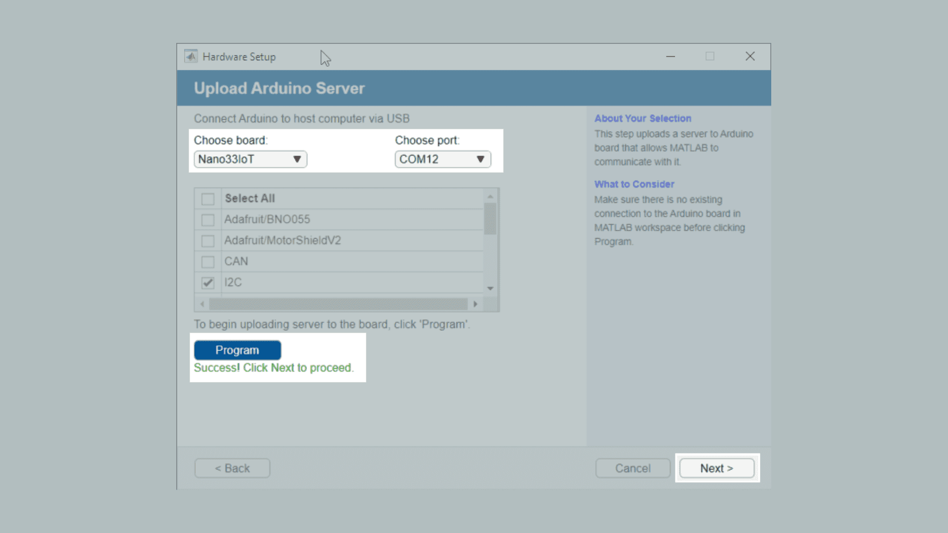 Program button to upload the Arduino Server to the board. When you have done so, click on next.In order to use the full functionality of the Nano Motor Carrier, you must ensure that the I2C and ArduinoMotorCarrier components are selected.