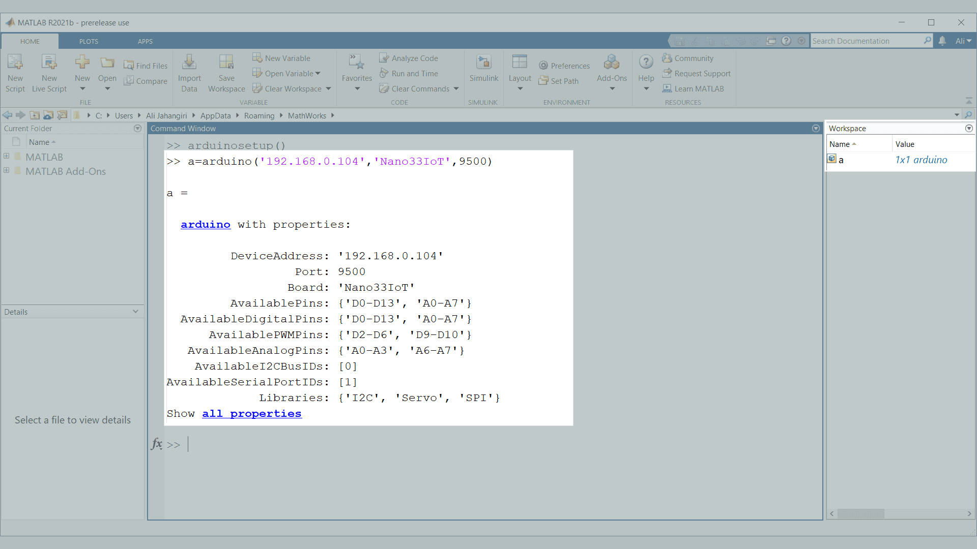 a = arduino('device address','Nano33IoT',port), where device address and port are the values you wrote down in the last step. If successful, the a object will be added to the MATLAB workspace.