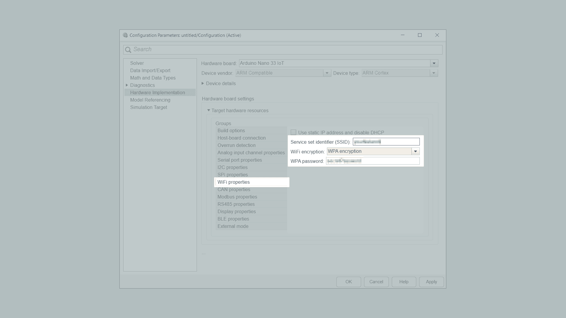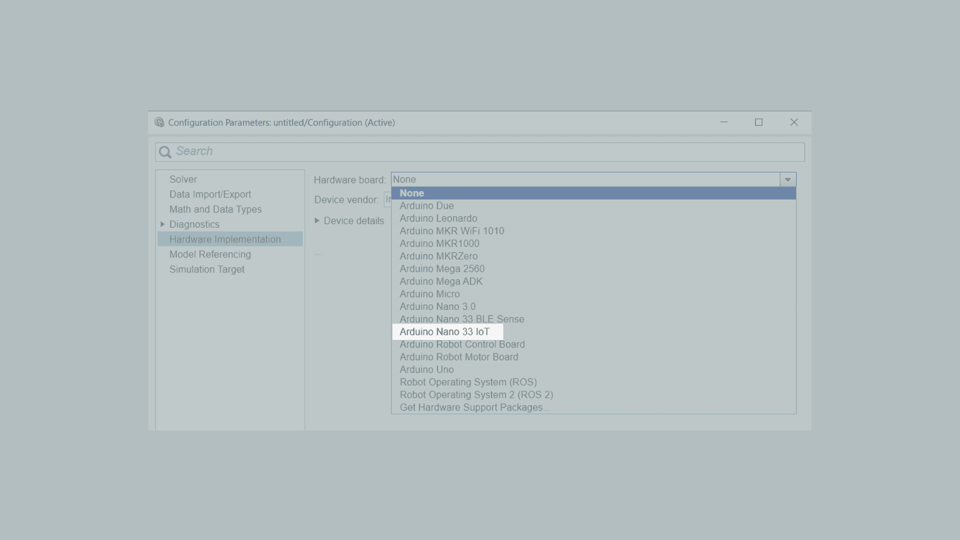 1. We will now configure Simulink to access the hardware IO directly. This will allow you to directly control the LED on the Nano 33 IoT, from the model running in your computer.