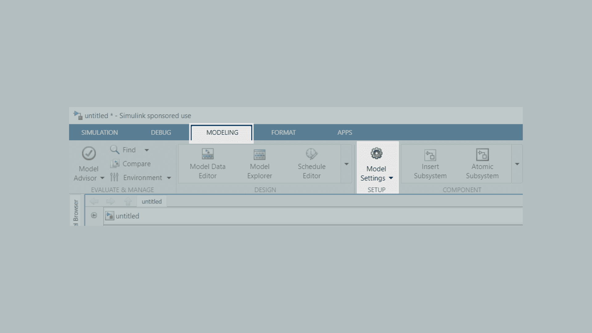 2. Under the Modeling ribbon, click on the Model Settings button. This window gives us many options for configuring how the model itself is run including the solver configuration, default data types, diagnostic warnings/errors and the hardware implementation. For the purposes of this tutorial, we will change the hardware implementation to reflect our setup.