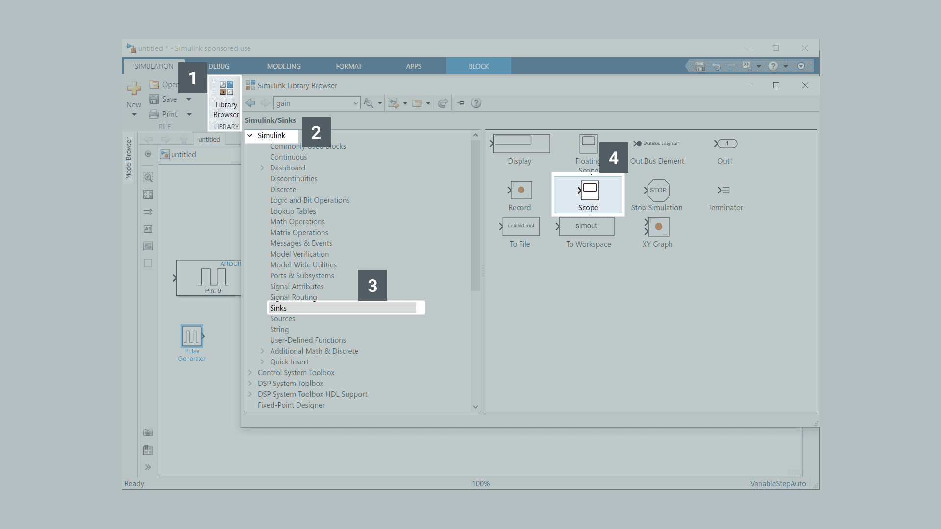 6. We will need one more component from the Simulink Library Browser. Under Simulink go to Sinks. Add the Scope block to your model. This will help us visualize the waveform generated.