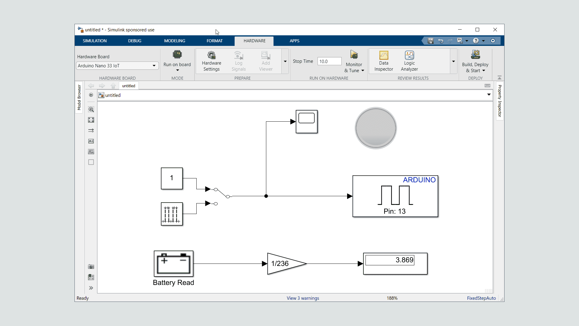 double then click on OK.7. Go to the Hardware ribbon. Make sure that the Mode is set to Run on board and that the Stop Time is set to 10. Click on Monitor and Tune. You should see the value on the Display block correspond to the voltage of the battery.