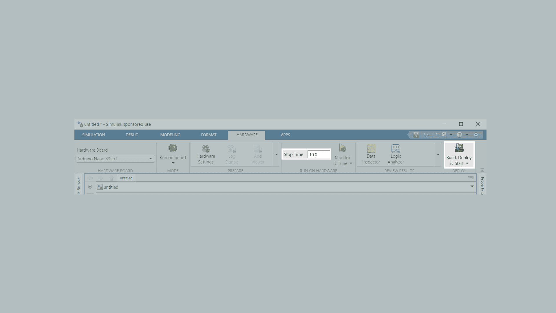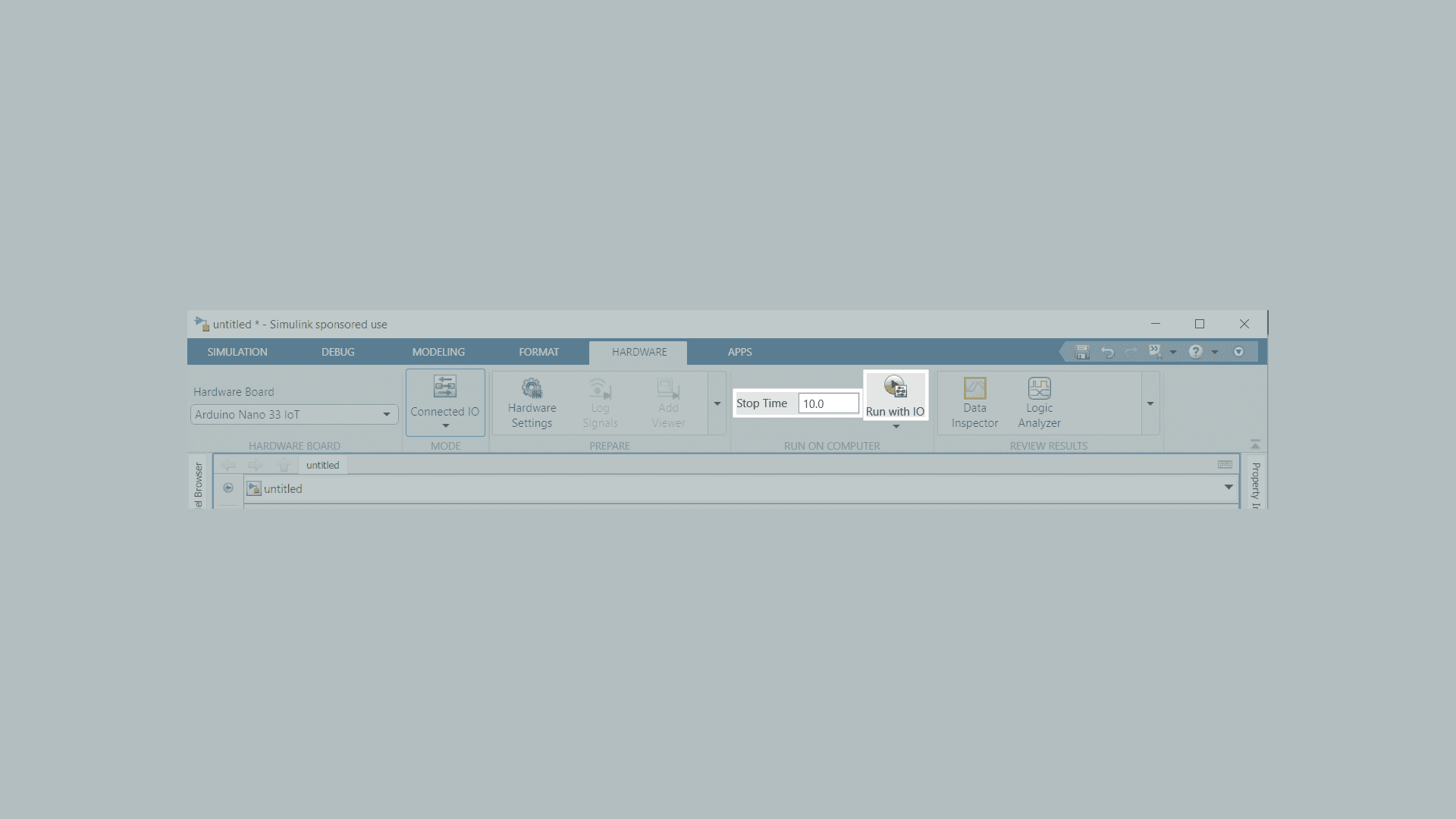 1. With the help of Simulink, we will enable standalone operation. In the Hardware ribbon, click on the downward arrow in the MODE section (from the previous section, it should be displaying Connected IO). Then choose Run on board (External Mode).