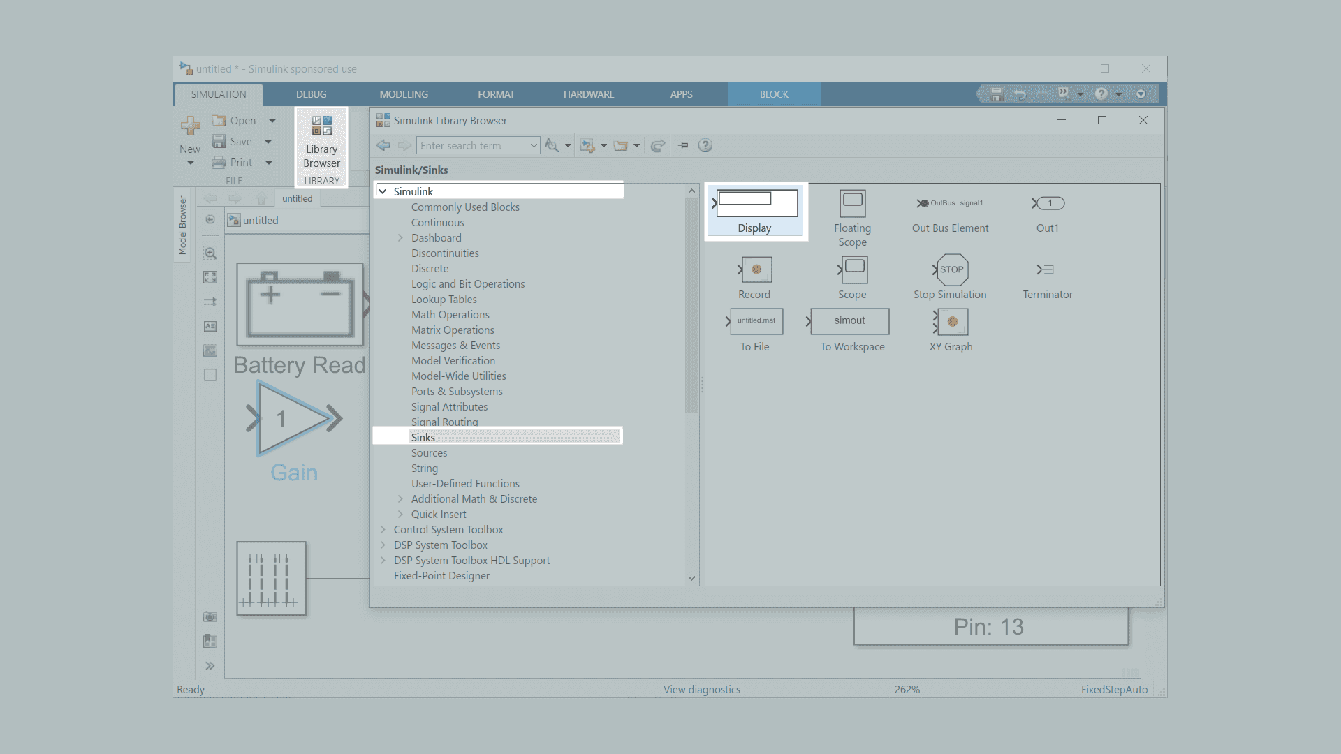 4. Now we need a way to display this value. In the Simulink category, under the Sinks subsection, find and add the Display block; this will allow us to see the values.