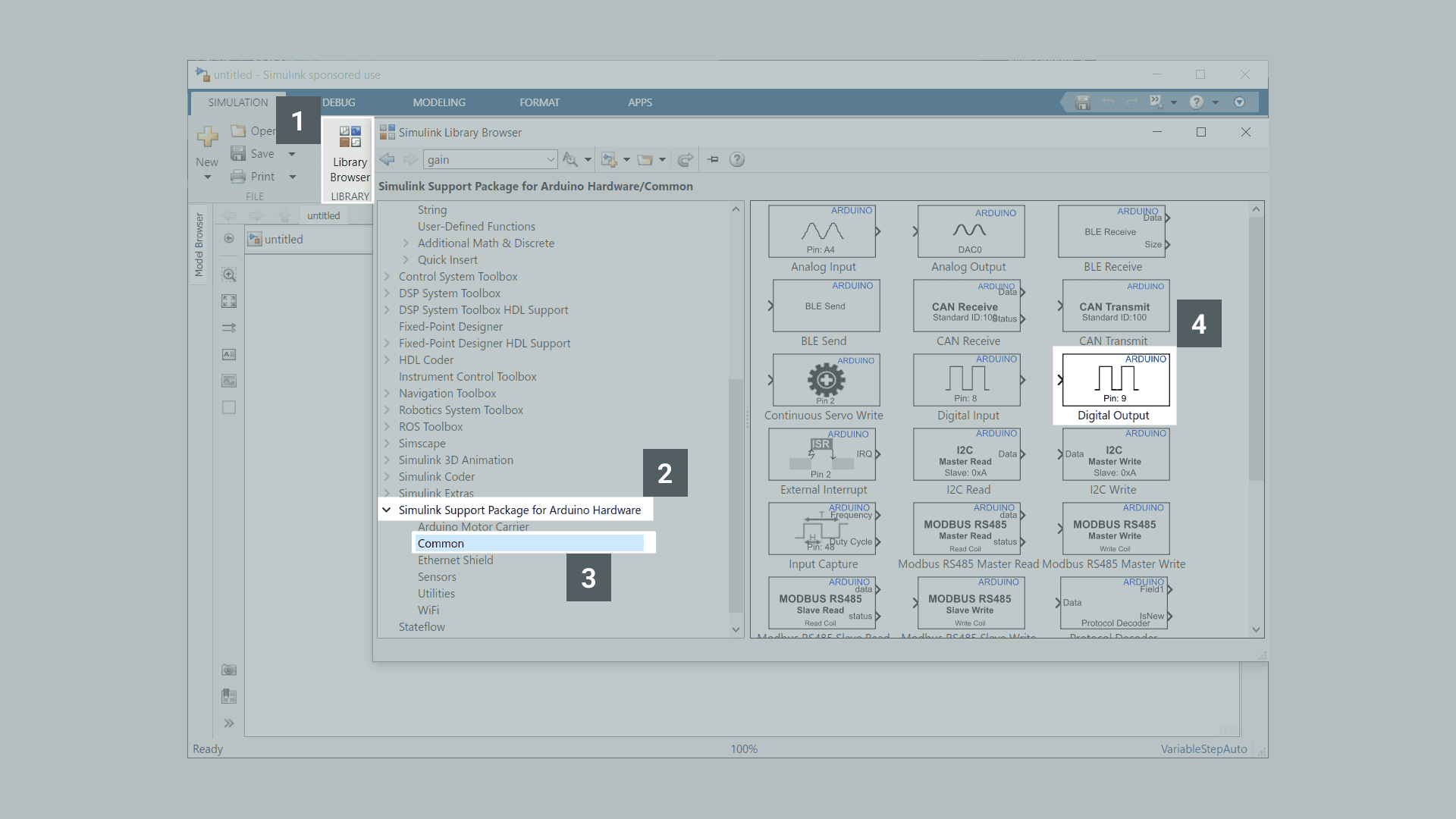 4. We can add blocks to do stuff, by selecting Library Browser from the Simulation ribbon. Under the Simulink Support Package for Arduino Hardware click on Common and add a Digital Output block. We will use this to control the LED on Pin 13.