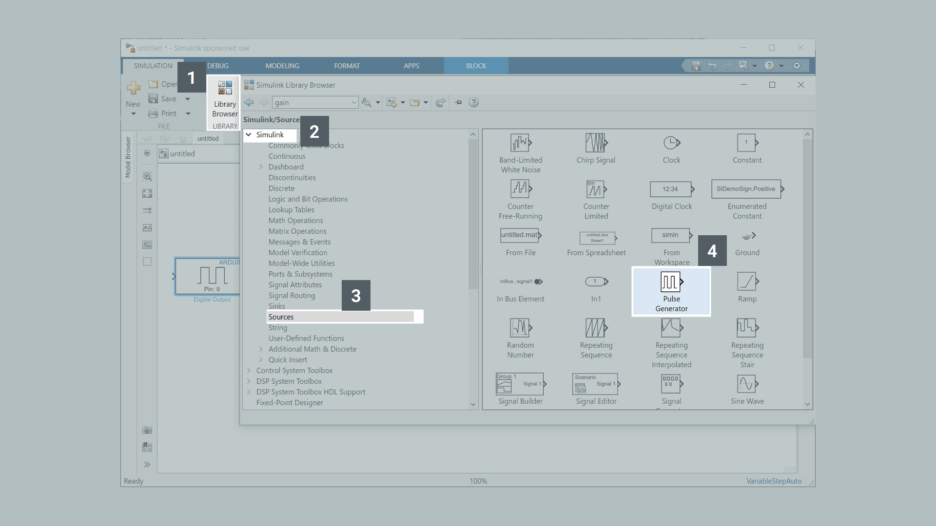 5. Go back to the Simulink Library Browser and under Simulink click on Sources. A list of different components that can act as sources, appear. Add the Pulse Generator block to you model. This block will help us generate the signal to turn the LED on and off.