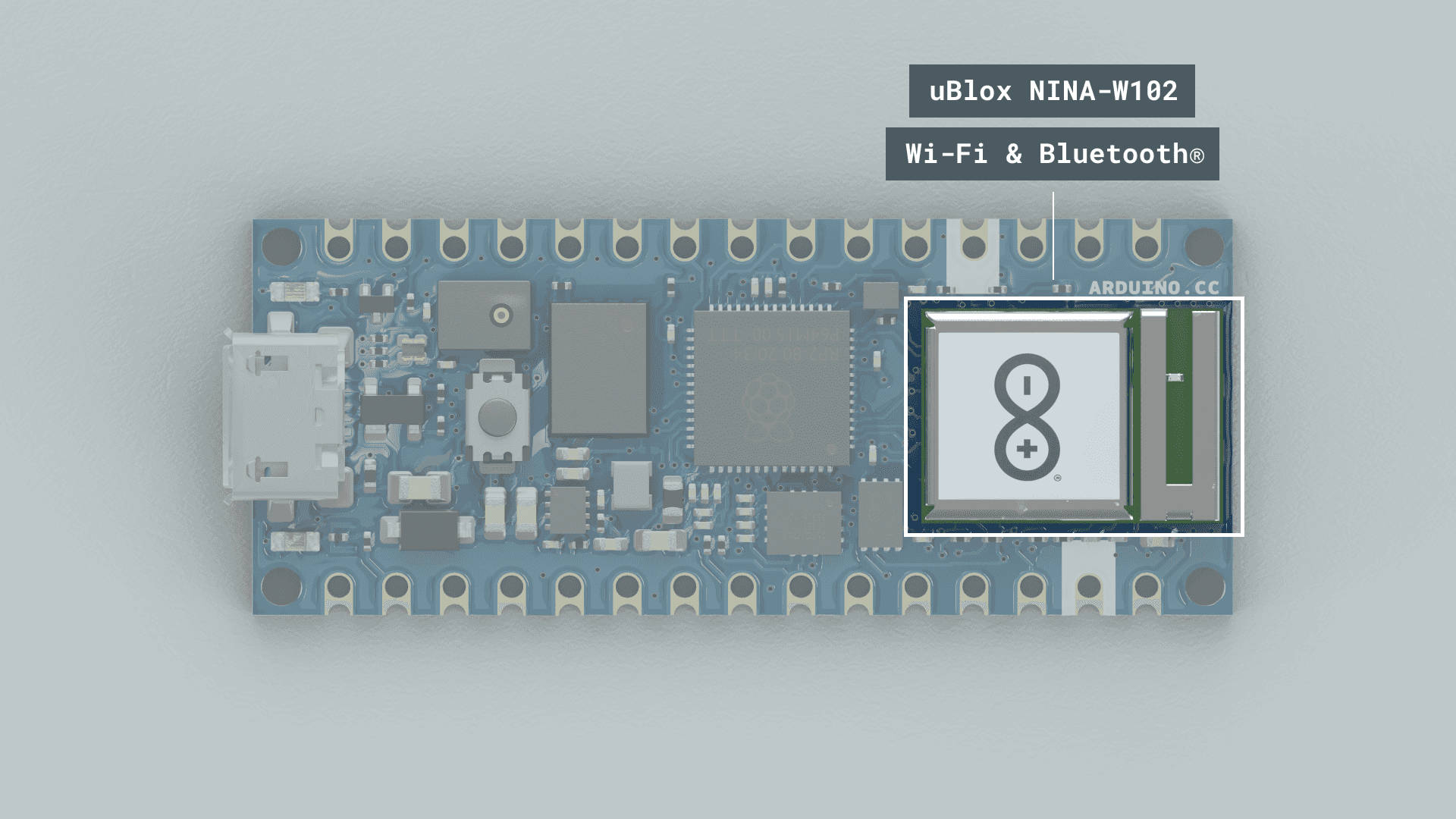 The Nano RP2040 Connect supports both Wi-Fi and Bluetooth® through the uBlox W-102 module. To use this module, we can use the WiFiNINA library or the ArduinoBLE library.