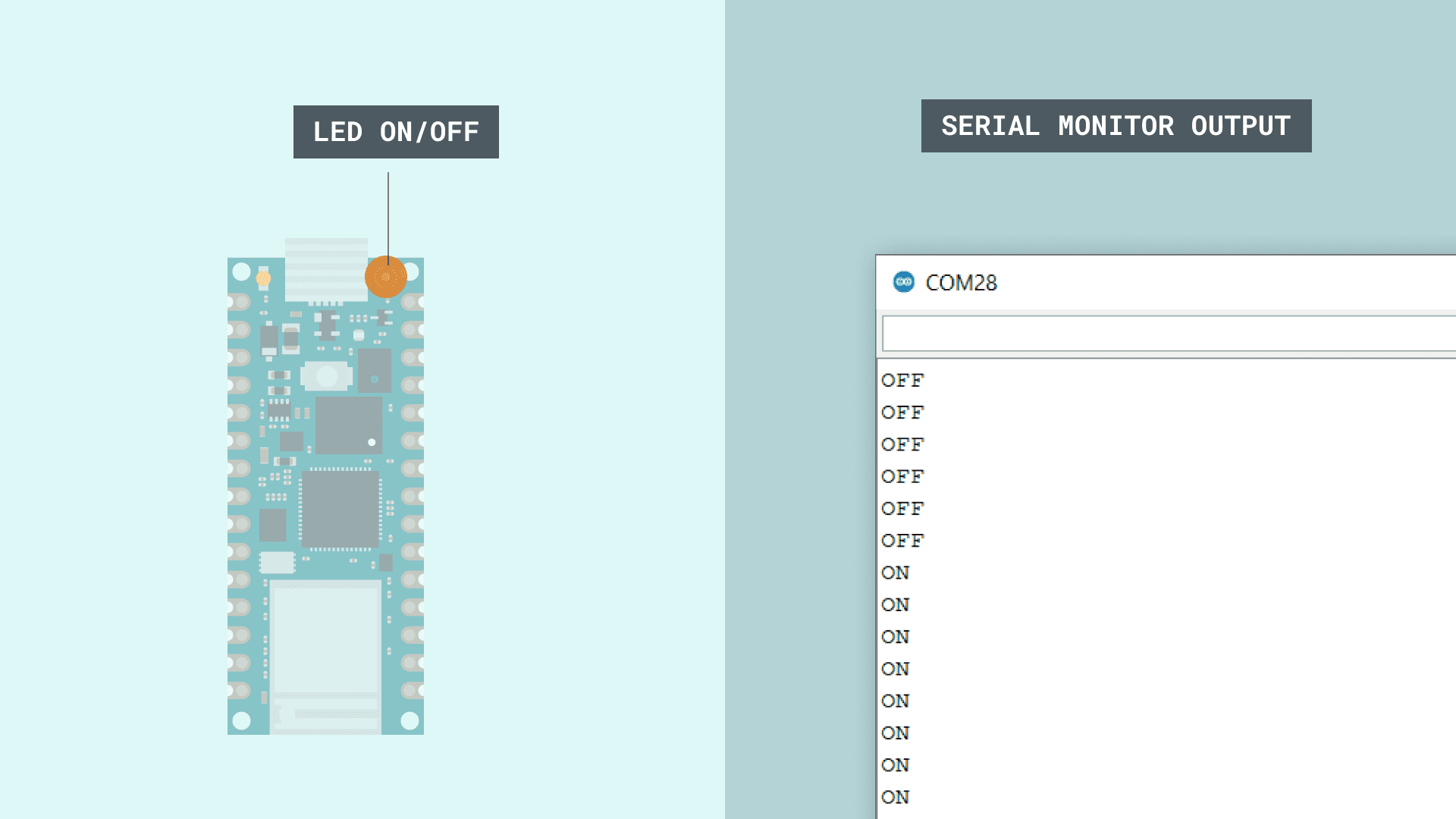 Now, if we press the button on the peripheral device, we can see two things change on the central device. The blue LED will turn ON, and the Serial Monitor will instead print "ON". We can now turn ON or OFF the LED, through pushing the same button.
