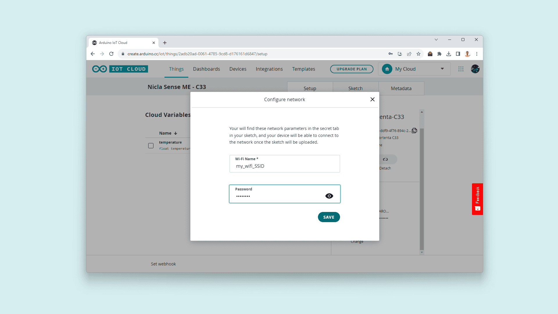 Once the variable is added, let's define the Wi-Fi® credentials for the board, for this, click on your Thing Network setting and add your Wi-Fi® SSID and password: