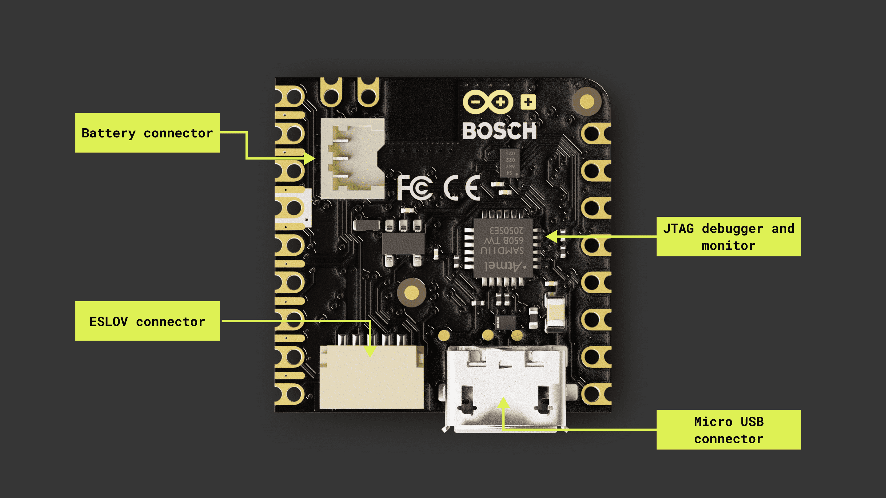 The Nicla Sense ME board features an onboard ESLOV connector meant as an extension of the I2C communication bus. This connector simplifies the interaction between the Nicla Sense ME and various sensors, actuators, and other modules, without soldering or wiring.