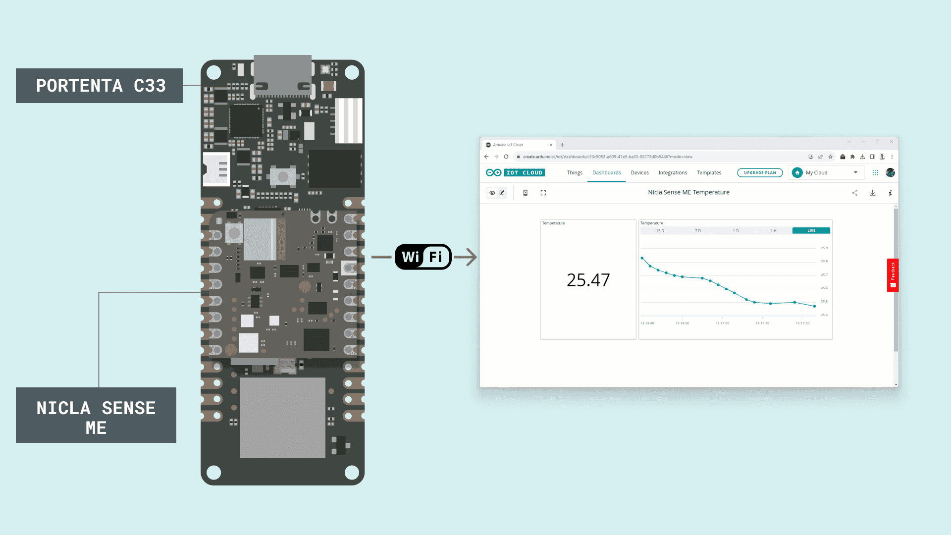 Finally, after searching for and connecting to your Wi-Fi® network, it will gather the temperature information from the Nicla Sense ME. Every 2 seconds it will forward it to the Cloud where we can monitor it from anywhere in the world and from any device.
