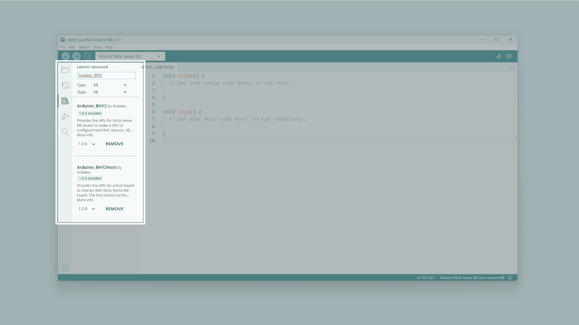 Nicla Sense ME and install the latest Arduino Mbed OS Nicla Boards version.
