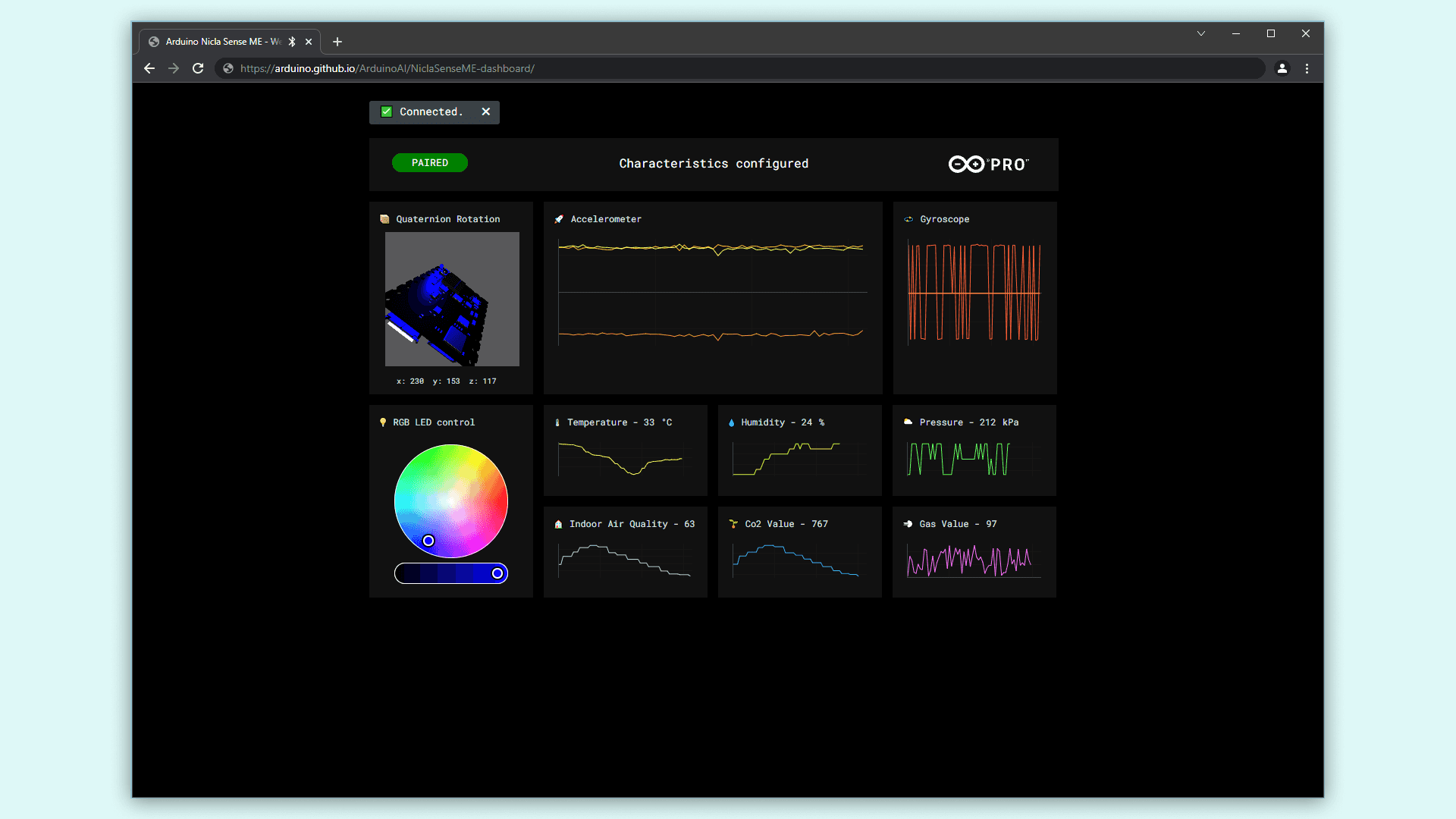 A previous version of this dashboard was developed to be used with the Arduino® Nano 33 BLE. You can see a video that shows how it looks here.