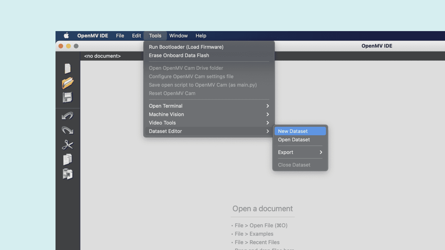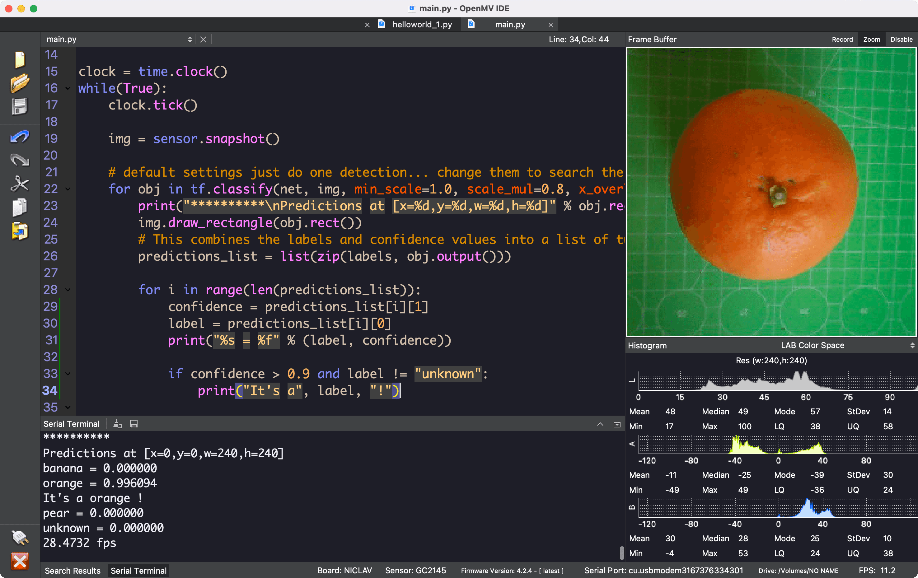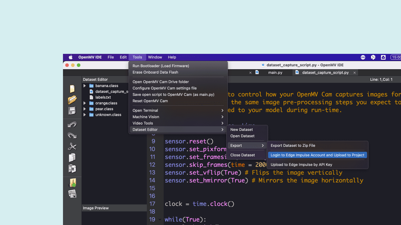 The final step is to run the ei_image_classification.py script. Open it in the OpenMV IDE.