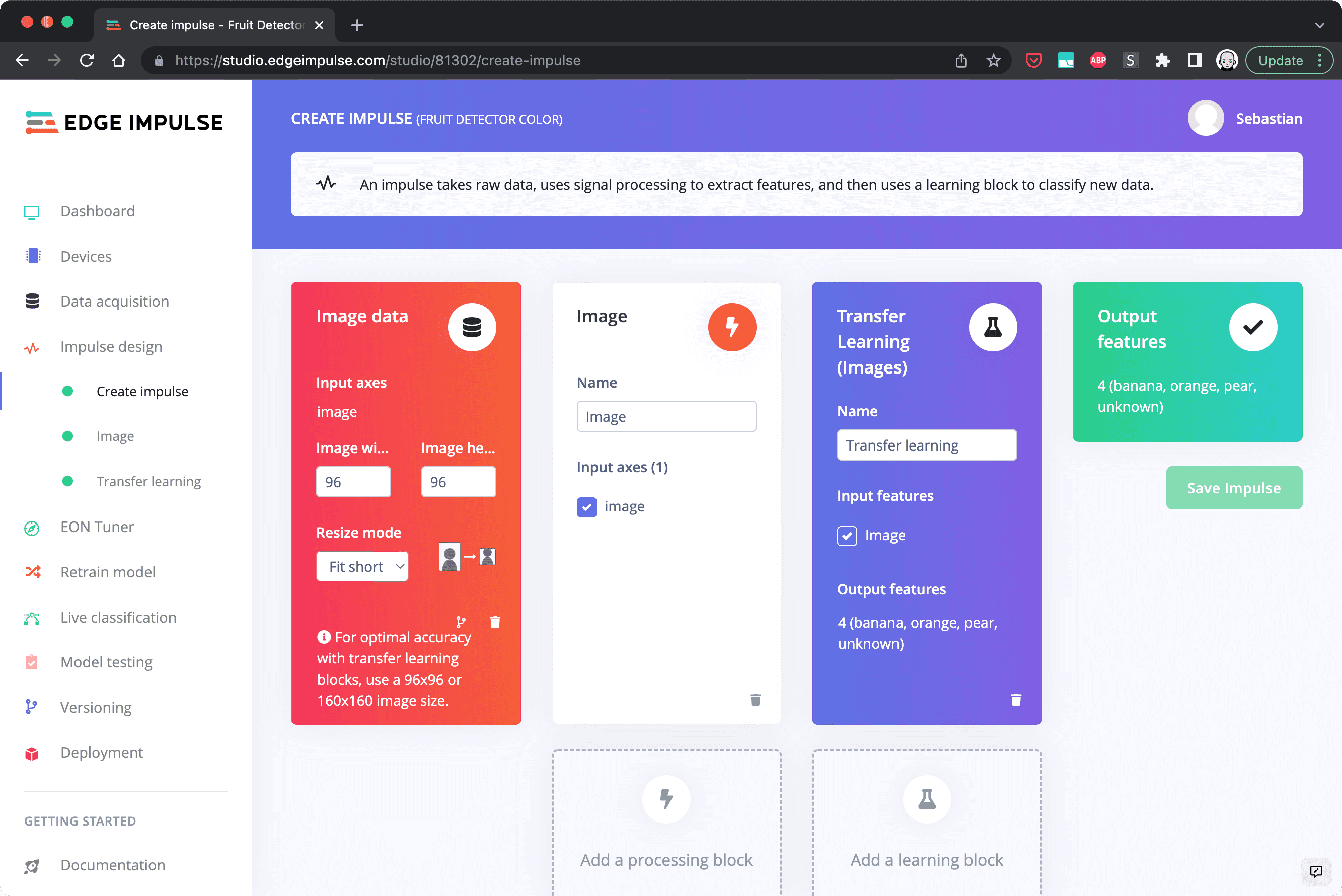 If you're happy with the data samples you can move on to designing your impulse. An impulse is in a nutshell a recipe with which the model is being trained. It defines actions that are performed on your input data to make them better suited for machine learning and a learning block that defines the algorithm for the classification. In the menu navigate to "Create Impulse" under "Impulse Design" and add an Image processing block as well as a Transfer Learning learning block.