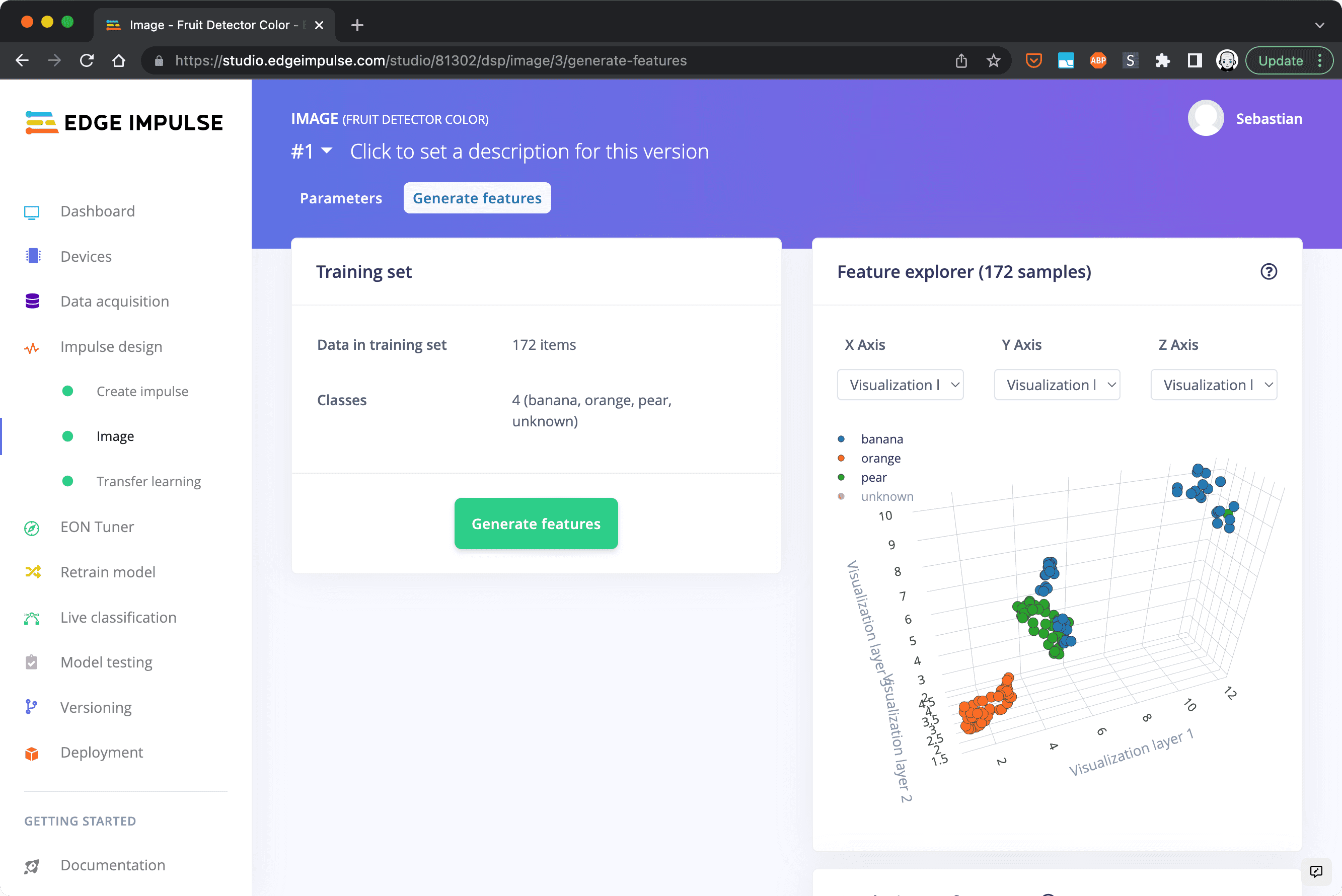 Then click on "Generate Features". The analysis process will take a while to complete depending on the amount of images that you uploaded. When it's done you can inspect the results. On the right hand side you can see a visualization of the features in a 3D space. You can see that some bananas (blue dots) and pears (green dots) are somewhat hard to tell apart possibly due to their long-ish shape and the stem and therefore have some data points in close proximity. An orange on the other hand is easier to distinguish as it looks quite different.