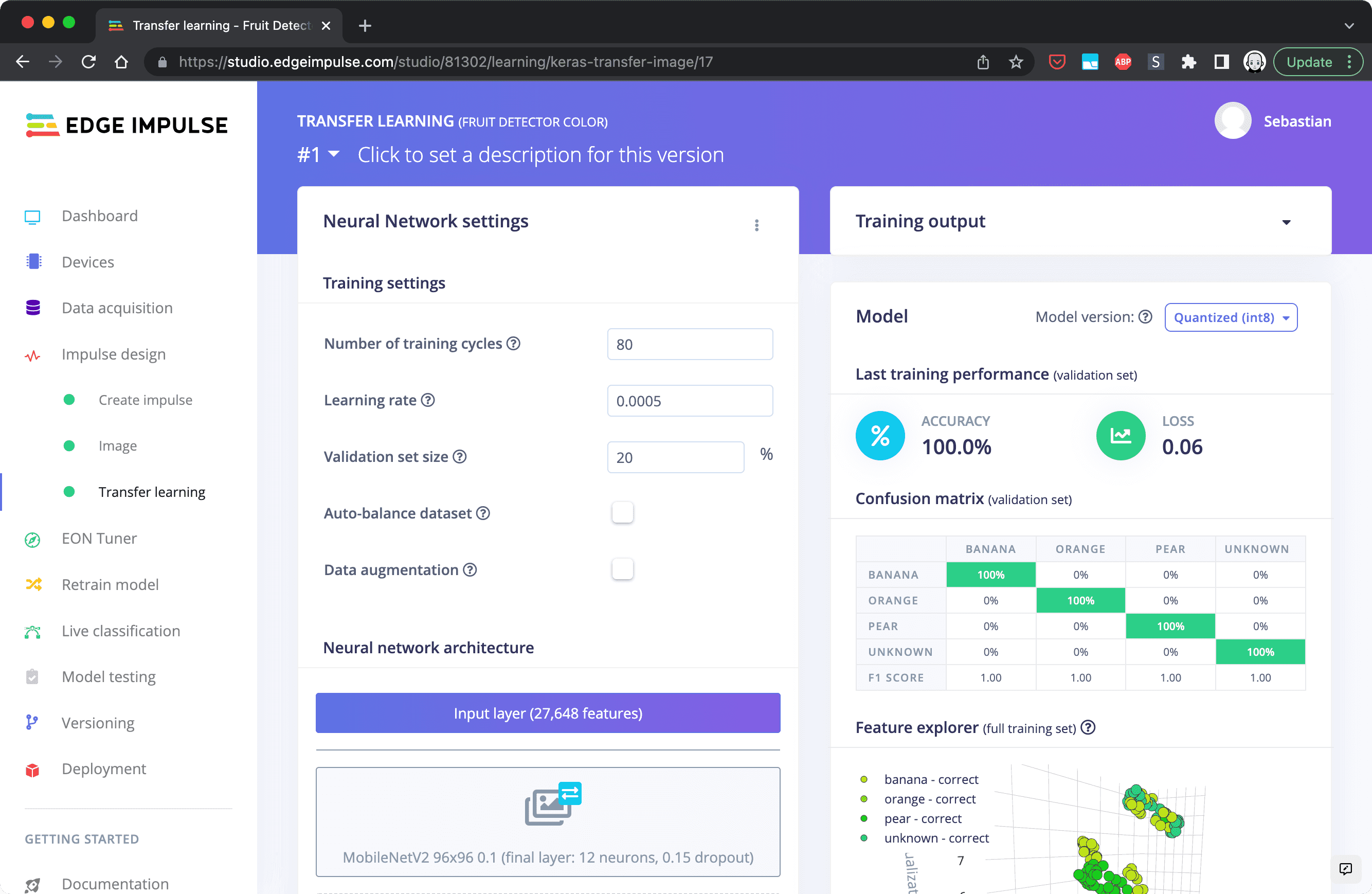 Now that the features of your image data are ready to be used for the actual training you can navigate to "Transfer Learning" in the menu. You need to tweak the settings slightly. Set the "Number of training cycles" to a number that yields good results. In this example we chose 80. This defines how many times the model is being trained. The model gets better with each cycle the same way you get better when learning how to ride a bike and you practice it the first couple of times.
