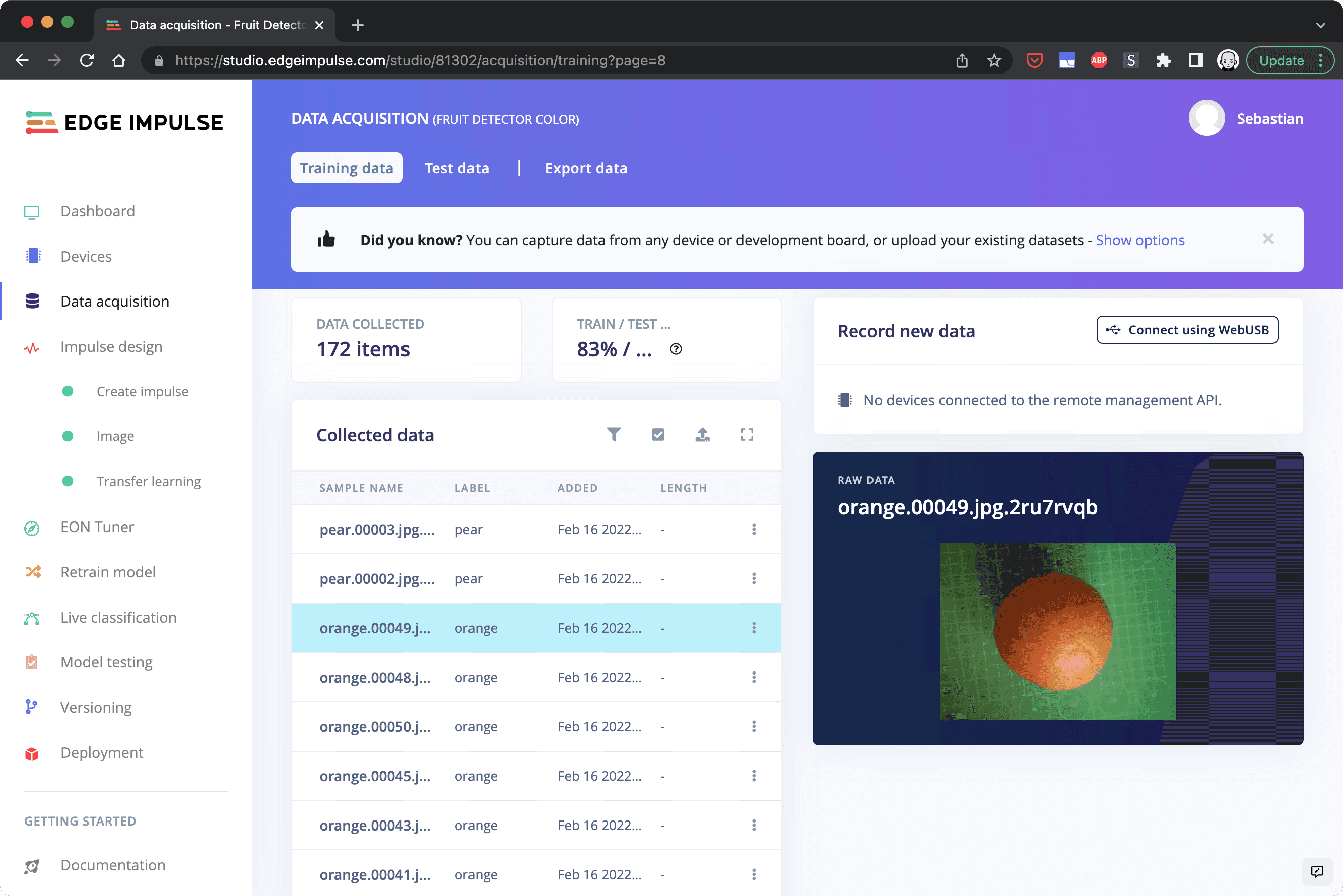 Open your project in the Edge Impulse® studio and navigate to "Data Acquisition". You can see that the images have been uploaded and labeled according to the classes that you created. With this tool you can browse through the image samples and remove the ones which you don't deem valuable for the training (e.g. if one of the images is too blurry). You could also do that in the OpenMV IDE before you upload the data.