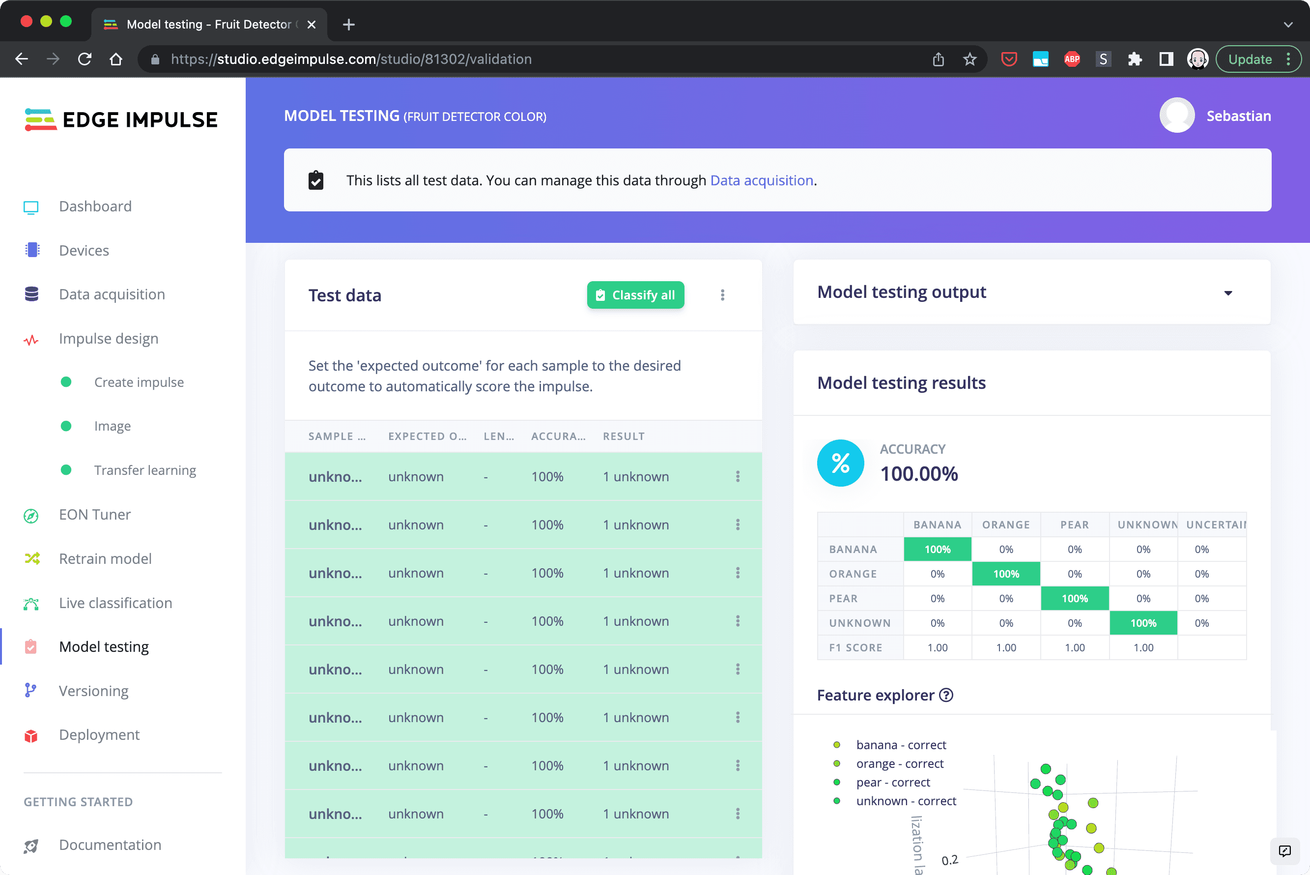 Edge Impulse® is a platform that simplifies the process of creating machine learning models by choosing reasonable defaults for the countless parameters you could set when creating a ML model. It provides a simple user interface that not only allows to train a ML model but also to inspect the data and test the model.