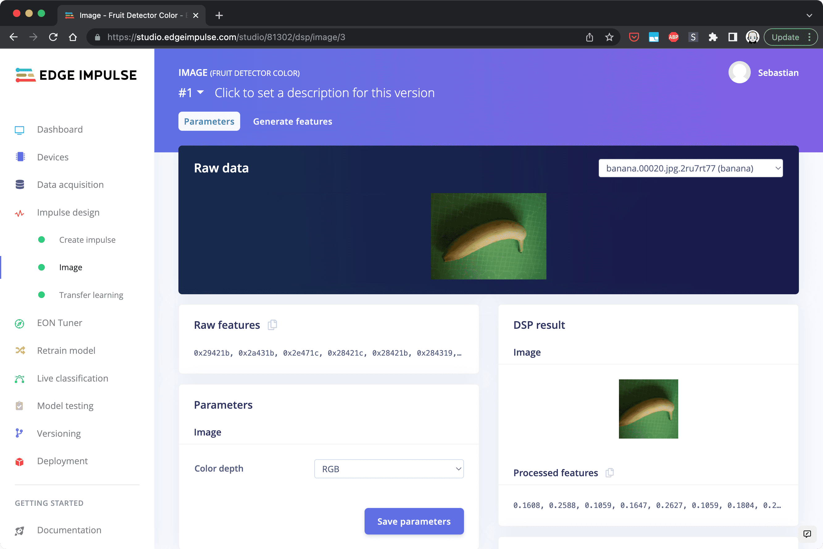 In this step you will adjust the image settings and generate the features from the input data. Features are unique properties that will be used by the classification algorithm to detect the objects. A feature can be the round shape of an orange or the fact that an image of a banana has many bright pixels as bananas are mostly yellow. In the menu navigate to "Image" under "Impulse Design". Set the color depth to "RGB" and save the parameters.