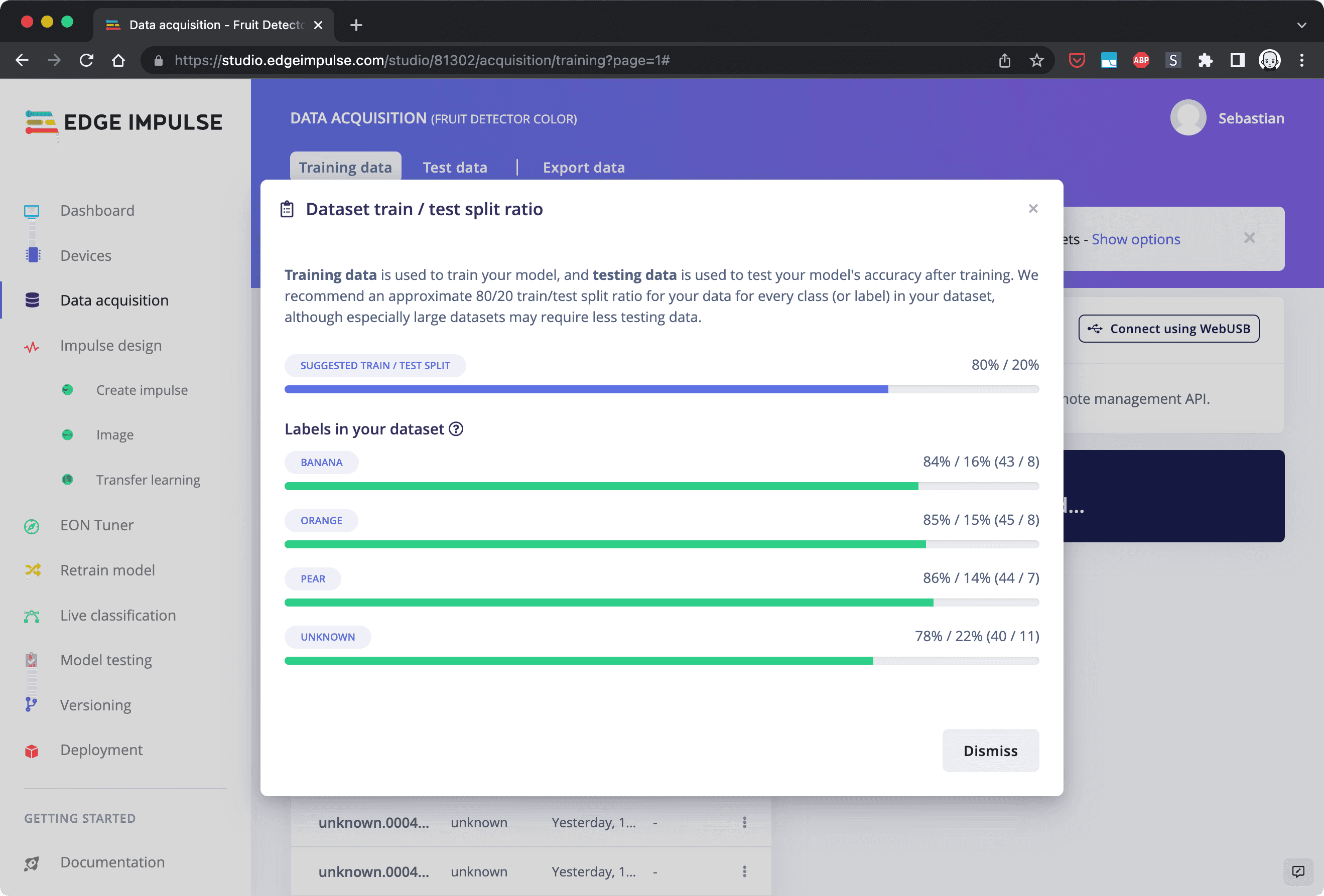 Fruit-Detector.After that you can go back to the OpenMV IDE and select Tools > Dataset Editor > Export > Log in to Edge Impulse® Account and Upload to Project. The OpenMV IDE will ask you for your Edge Impulse® login credentials. Select the project that you just created and click OK. Leave the data set split setting at the default. This will keep 20% of the images aside for testing the model once it has been trained. That allows you to assess how well your model performs at detecting the objects with data that it hasn't seen yet.