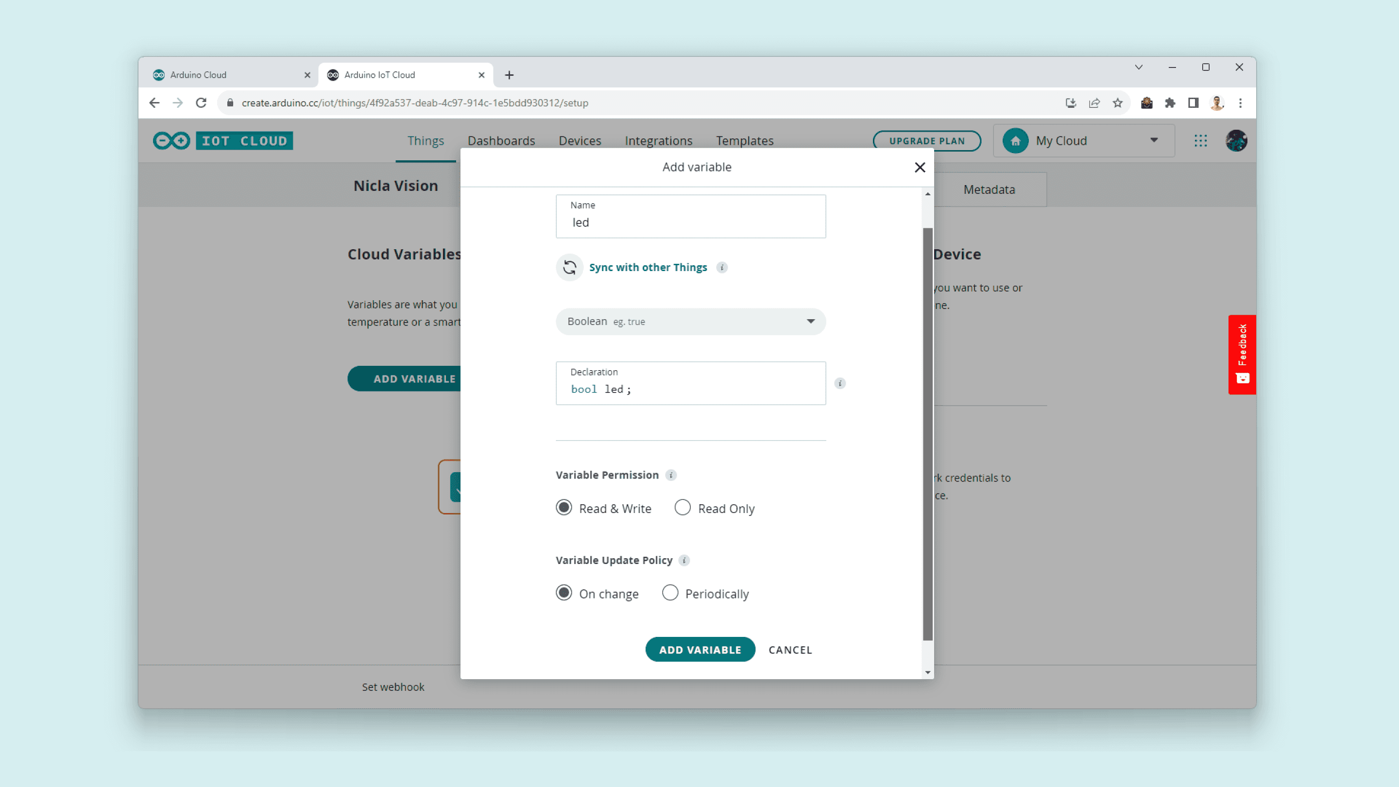 The project is ready to add variables to your "Thing"; navigate into Cloud Variables and click the ADD VARIABLE button.