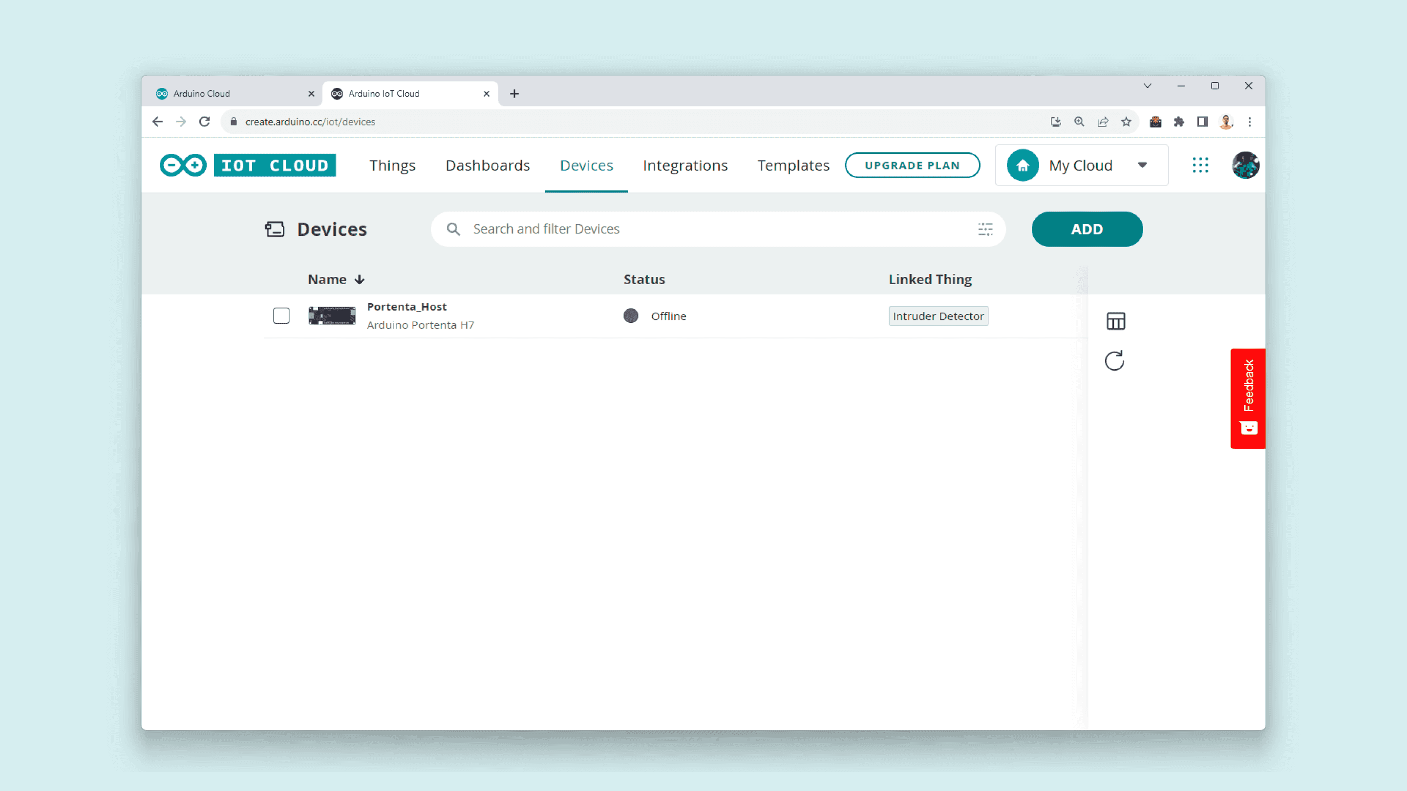 First, provision your Nicla Vision on your Arduino Cloud space. To do this, navigate to Devices and then click on the ADD button: