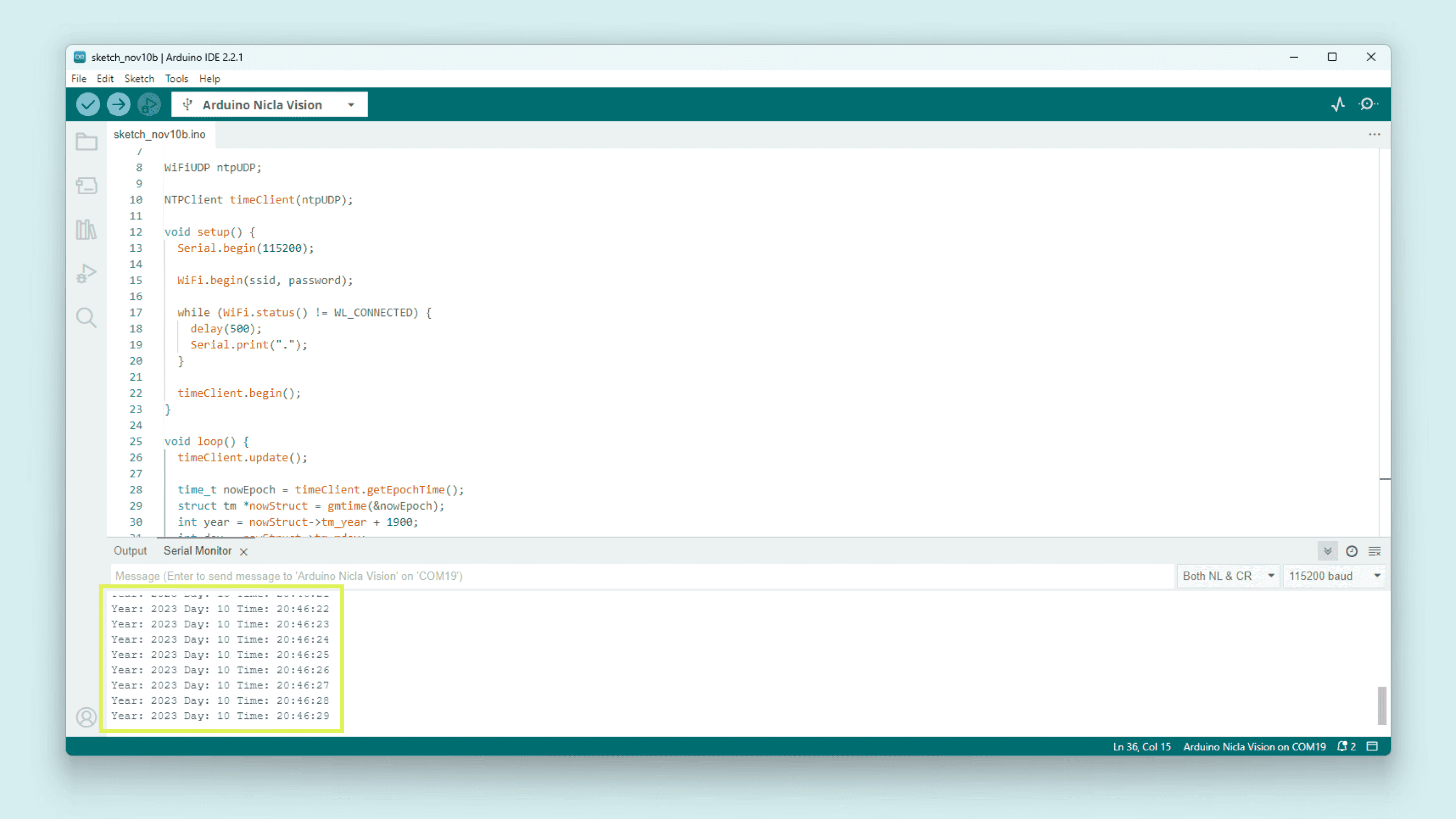 33 Serial.print("Year: ");34 Serial.print(year);35 Serial.print(" Day: ");36 Serial.print(day);37 Serial.print(" Time: ");38 Serial.println(timeClient.getFormattedTime());39